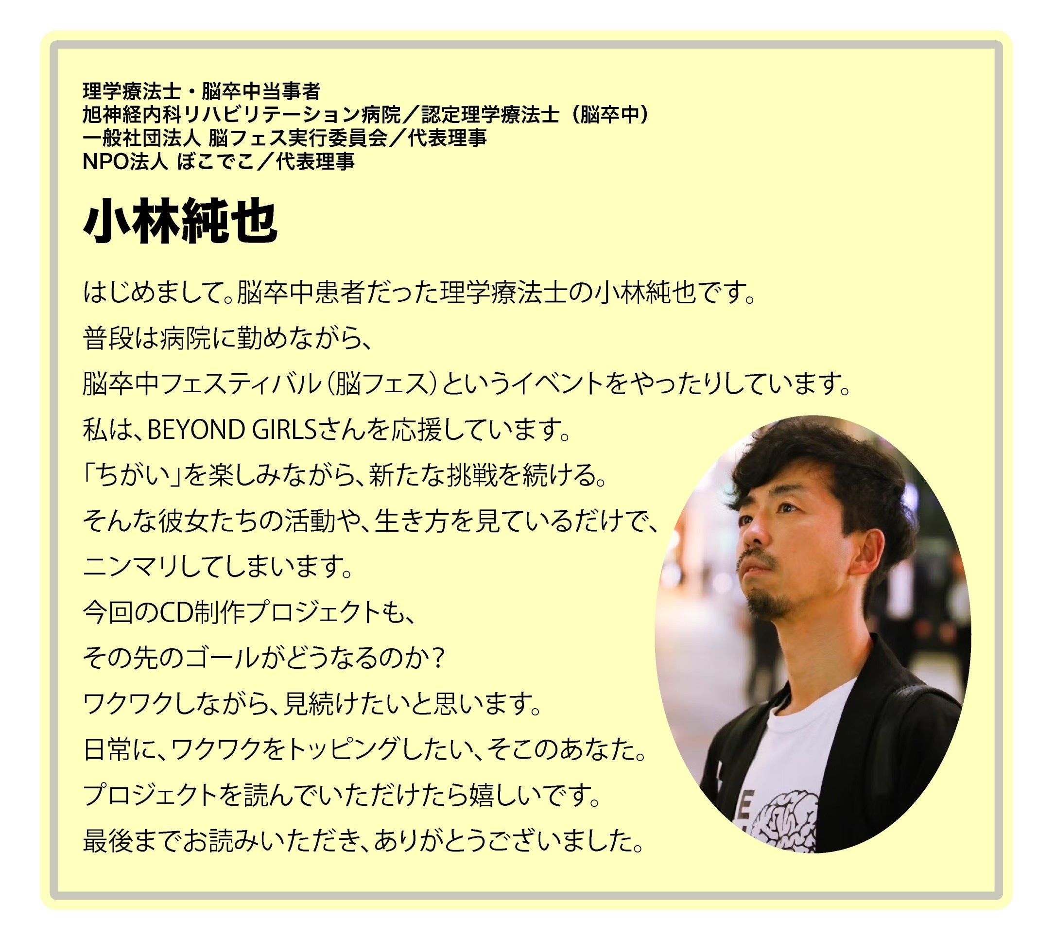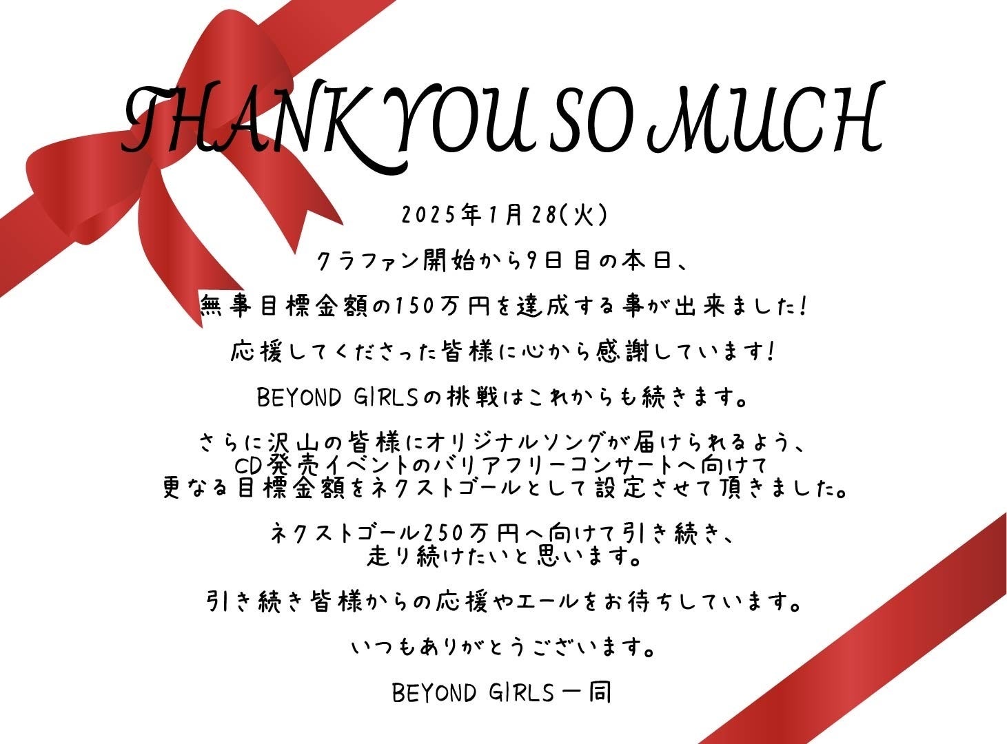 2025/03/27 17:46BEYOND GIRLSオリジナルソングCD発売&コンサート開催に向けてのクラウドファンディングが3/21(金)23:59をもって、終了いたしました!!!ーーーーーーーーー271人の支援者さん280万円の支援額ーーーーーーーーーが集まり、無事ネクストゴールを達成して幕を閉じる事が出来ました!応援や拡散、支援エールをして下さった方々に心からお礼を申し上げます。本当にありがとうございました!!!!!発送物やお礼のメッセージなどは、これから少しづつ作業していきますのでもう少しお待ち下さい!3/20(木・祝)には、CD発売記念トークライブとしてBEYOND GIRLSの3人で最後のステージを終え、200名を超える沢山の方々が最後の姿を見届けにきてくれました。コンサートとクラファンを無事終え、抜け殻のような状態ですが、少しだけ休んだら、またメンバーで再会してクラファンのリターンを対応していきますね!去年末に意を決して始まったBEYOND GIRLSオリジナルソング発売に向けての再始動。クラファンにコンサートに、次々とやる事が決まってどうなるんだろう、と不安や心配で頭がパンパンでした。年末にずっとみんなでクラファンのページを作ったり、クラファンが始まって今度はコンサートに向けての準備や集客があったりと、5年ぶりに再会したBEYOND GIRLSで感動もないままにみんなで必死になって向き合って話し合って作業をし続けた3ヶ月。人生で2度と出来ない経験をさせてもらえた事、そしてそんな不安がいっぱいだったクラファンやコンサートが無事に幕を下ろせた事は、支えてくれたみなさんのおかげです。改めて、ここまで支えて下さった全ての皆さんにお礼を申し上げます。自由で突発的なBEYOND GIRLSの活動を応援して笑顔で盛り上げてくれたみなさんの事をこれからも忘れずに活動をしていきたいと思います。BEYOND GIRLS3人での活動は、今回のオリジナルソングのCD発売と、記念コンサートを最後に幕を下ろしますが、BEYOND GIRLSの活動を通して得たもの、出会った人、経験は、一生忘れない宝物です。そしてそこから見つけた新しい可能性や好きな事に向かって、それぞれの道を歩んでいきますが、これからも変わらずに、チャレンジし続ける仲間としてそれぞれのことを応援してもらえたら嬉しいです!!!!突然の障害や難病に襲われ、孤独を感じていた私たちが奇跡的に出会い、沢山の素敵な経験や人々と巡り会い前向きに生きられるようになりました。車椅子になったからこそ見えた世界や出会いがありました。オリジナルソング「BEYOND EVERYTHING 」を通して、私たちが出会い前向きになれたように、沢山の方々が笑顔になれるメッセージが届いていたら嬉しいです。人生って考え方次第でどうにでもなる。そう教えてくれたBEYOND GIRLSと支えてくれた皆様に心から感謝いたします。ありがとうございました。BEYOND GIRLS もっと見る
