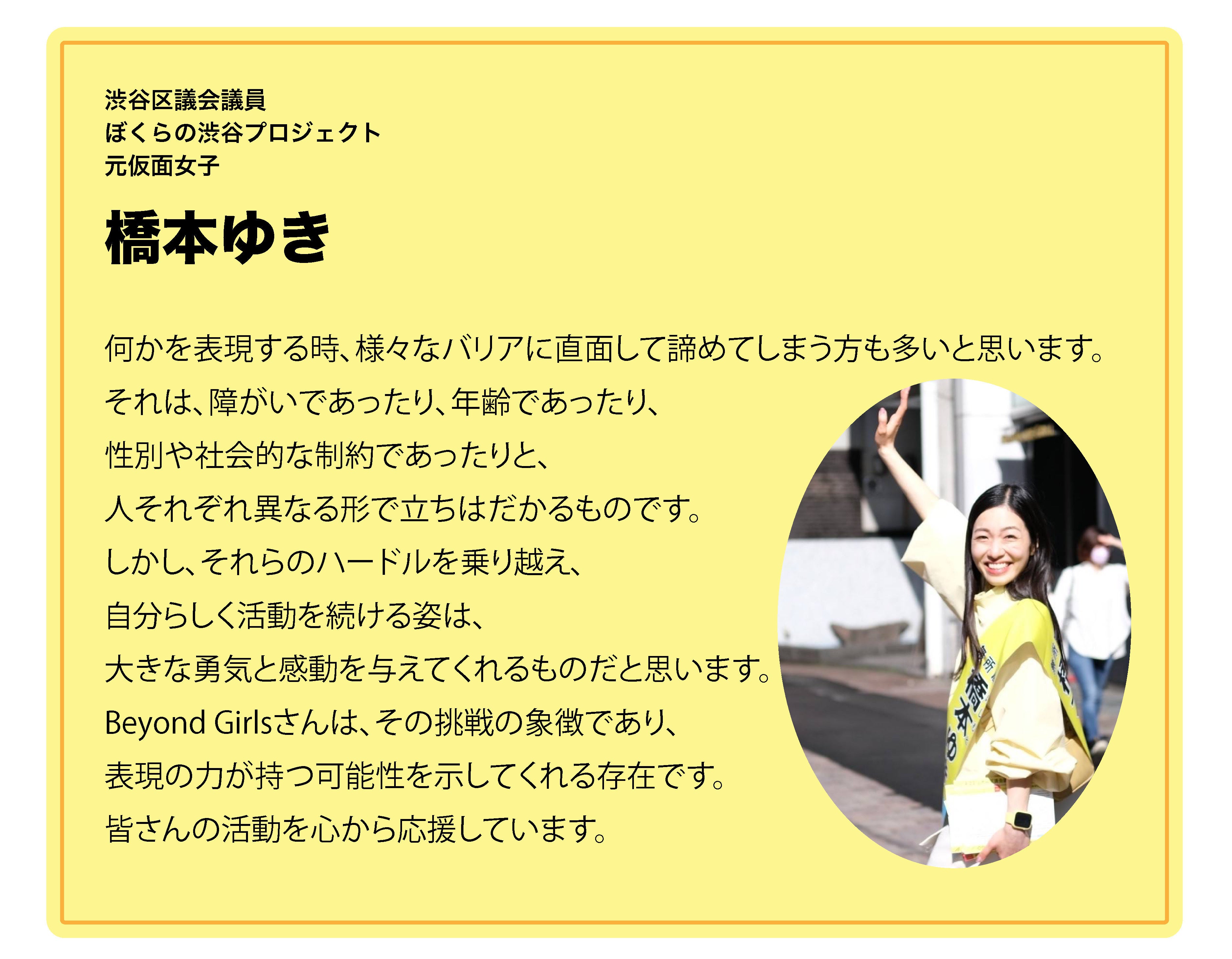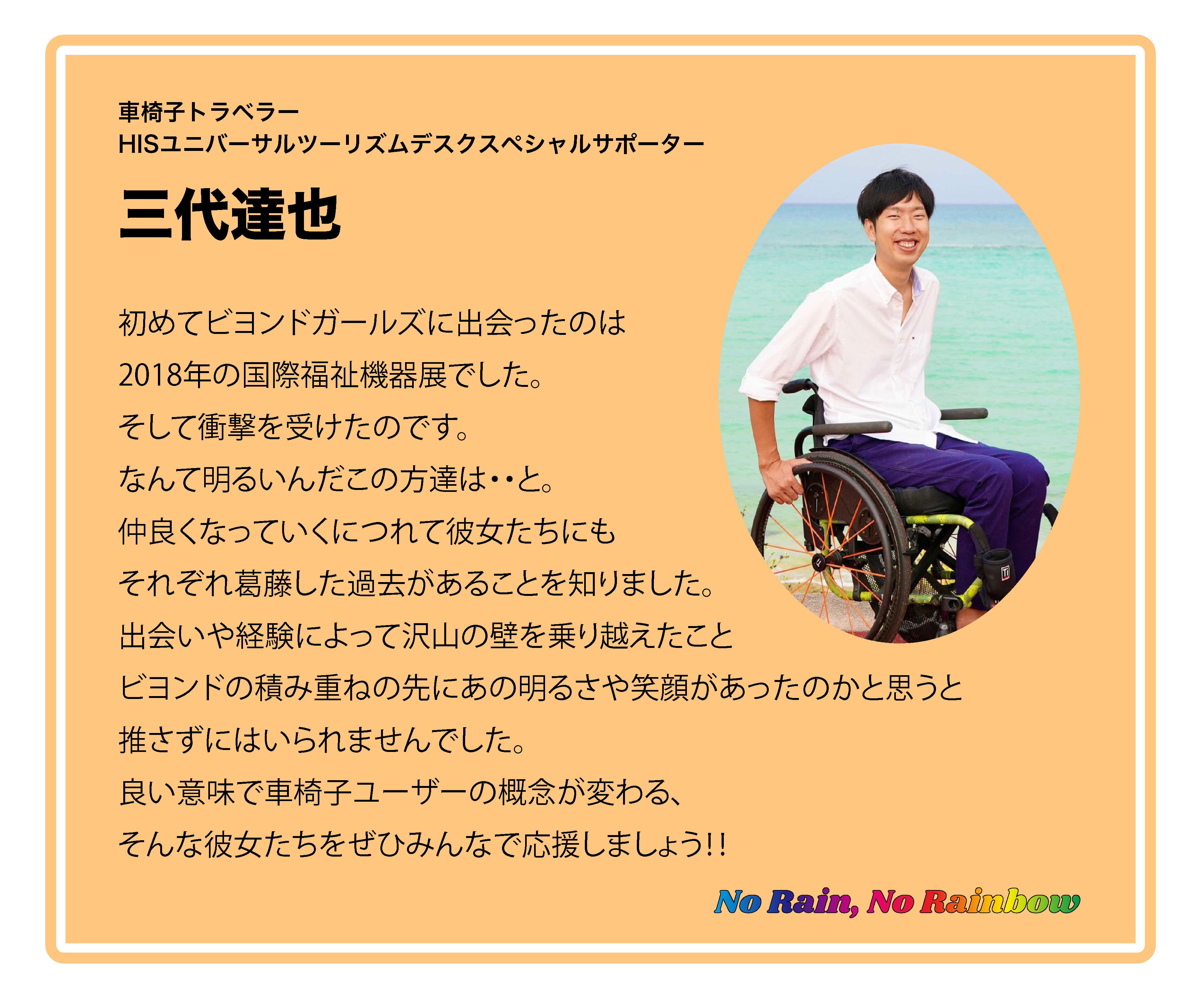 BEYOND(ビヨンド)とは英語で「乗り越える」「超える」という意味。違いを超えて、障がいや病気、自分自身の課題を超えて、車椅子や障害を理由に無理だと思われている社会常識を変え、BEYOND GIRLSとして、様々な活動をしてきました。