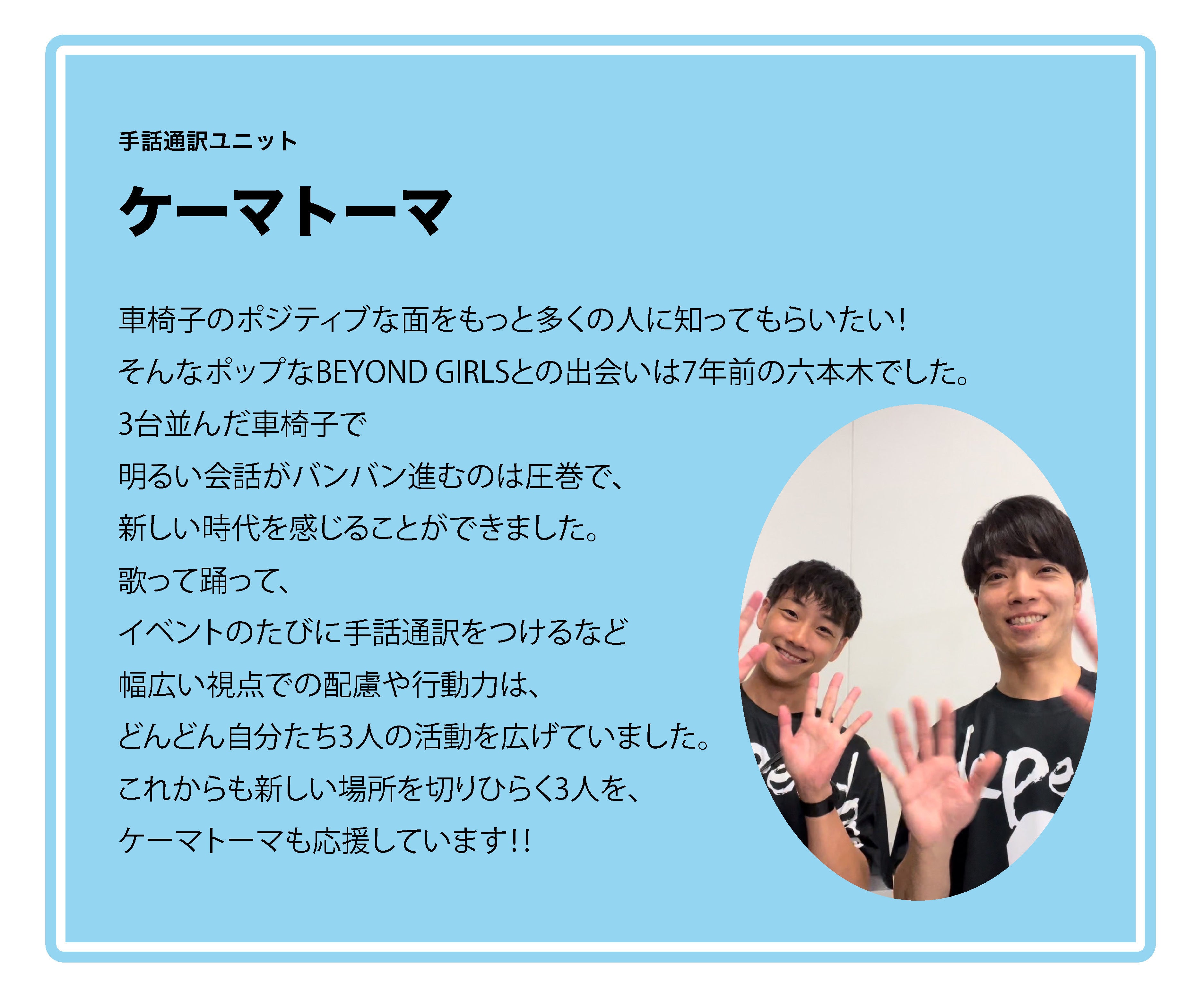 「BEYOND GIRLS」は、車いすで生活する私たちが、「障がい」という枠を超えて、あらゆる可能性に挑戦し続けるチャレンジユニットです。