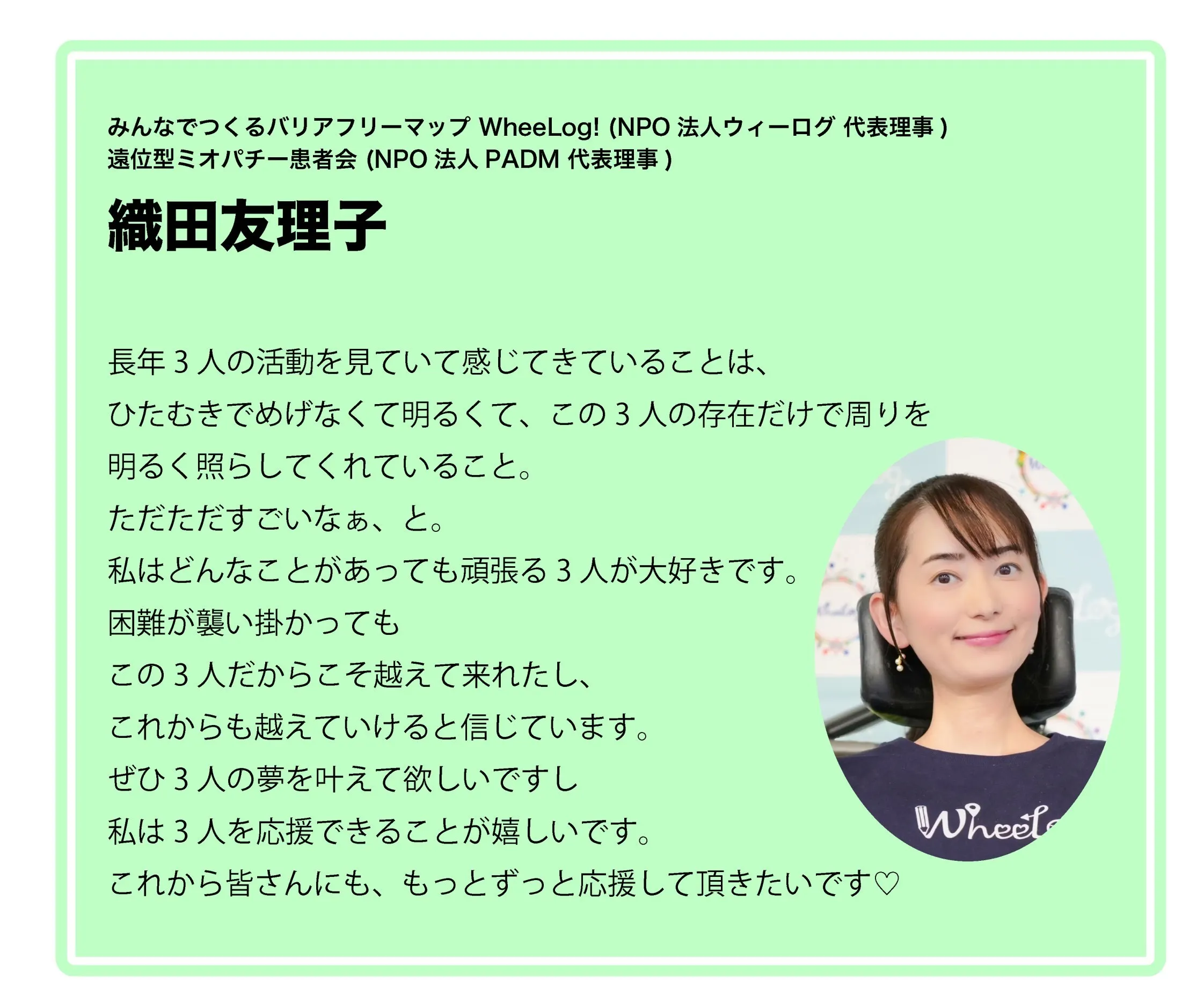 障がいがあっても、どんな困難も乗り越えられるという可能性を感じる事ができるようになりました。