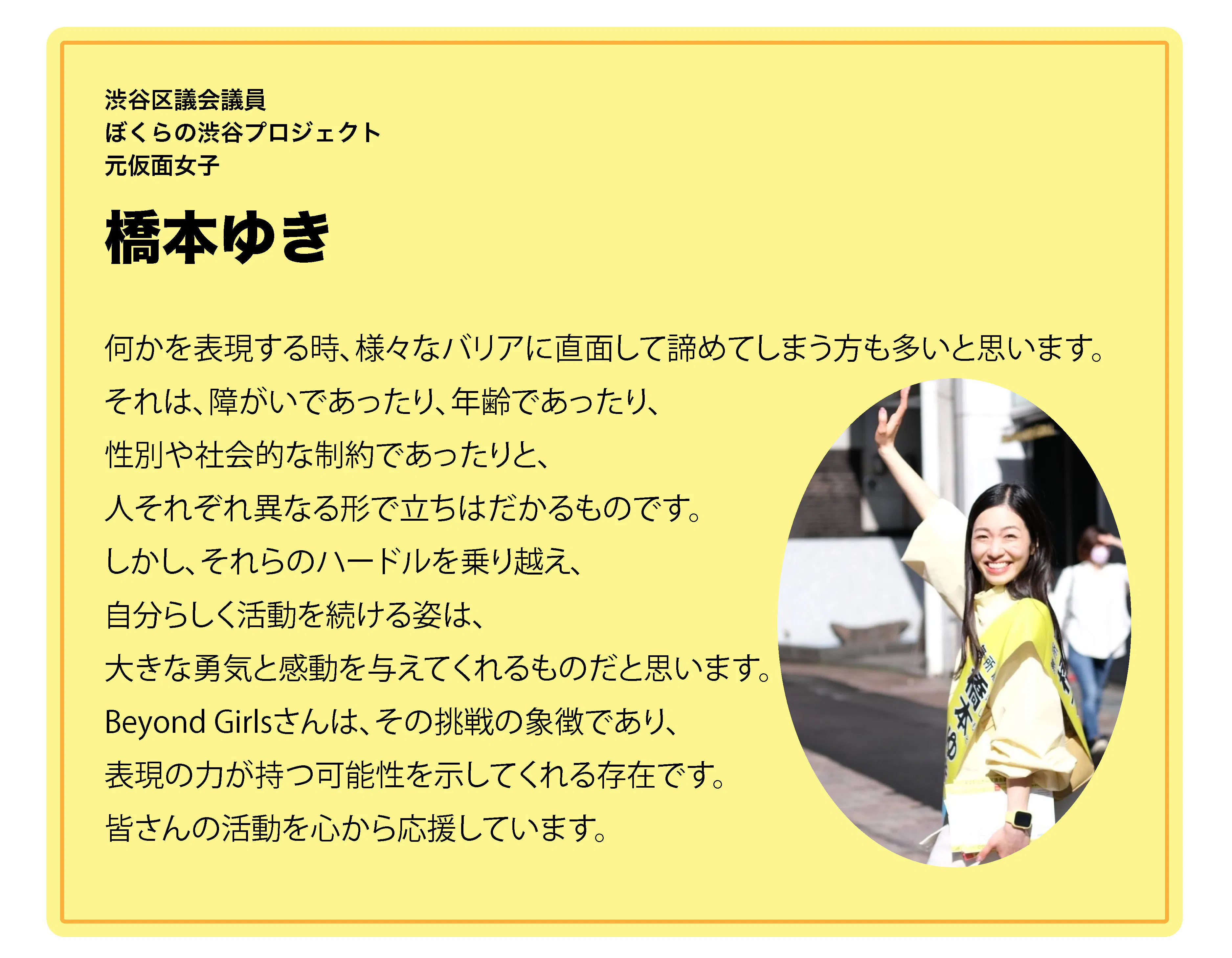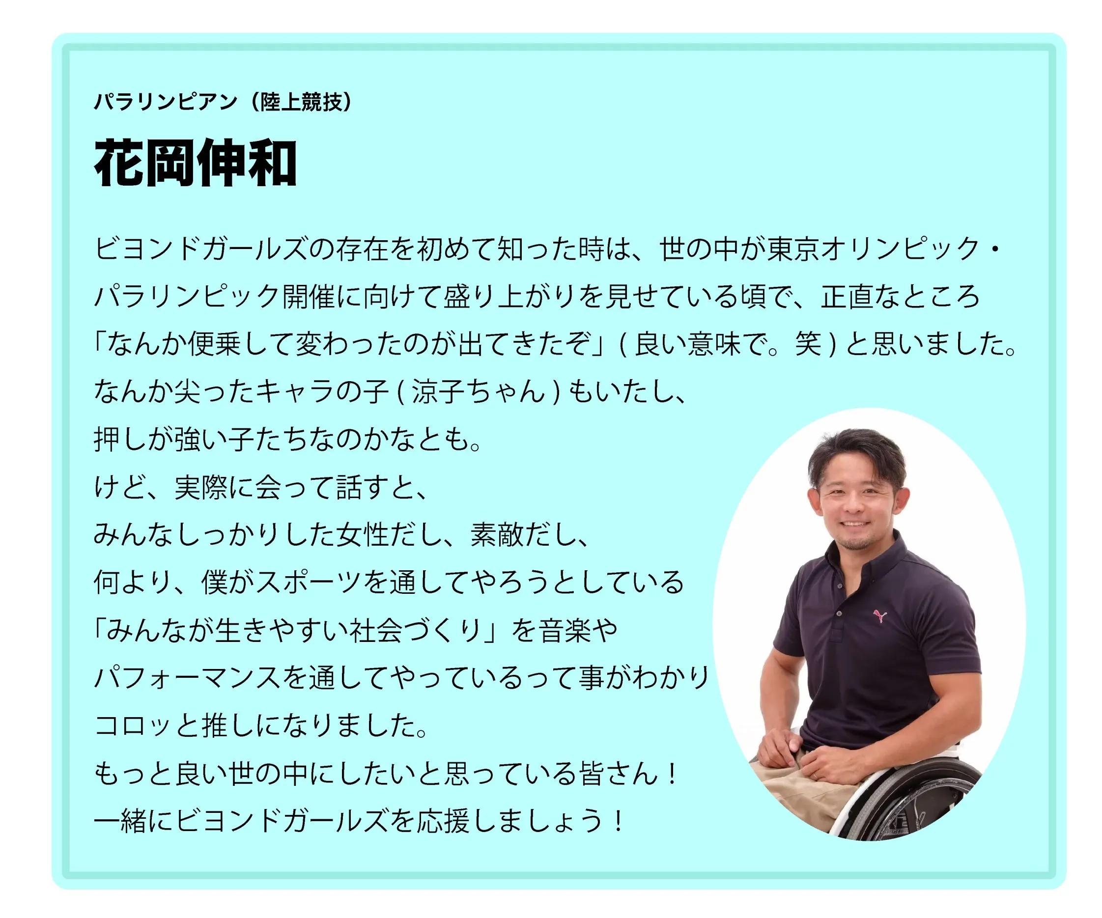 BEYOND(ビヨンド)とは英語で「乗り越える」「超える」という意味。違いを超えて、障がいや病気、自分自身の課題を超えて、車椅子や障害を理由に無理だと思われている社会常識を変え、BEYOND GIRLSとして、様々な活動をしてきました。
