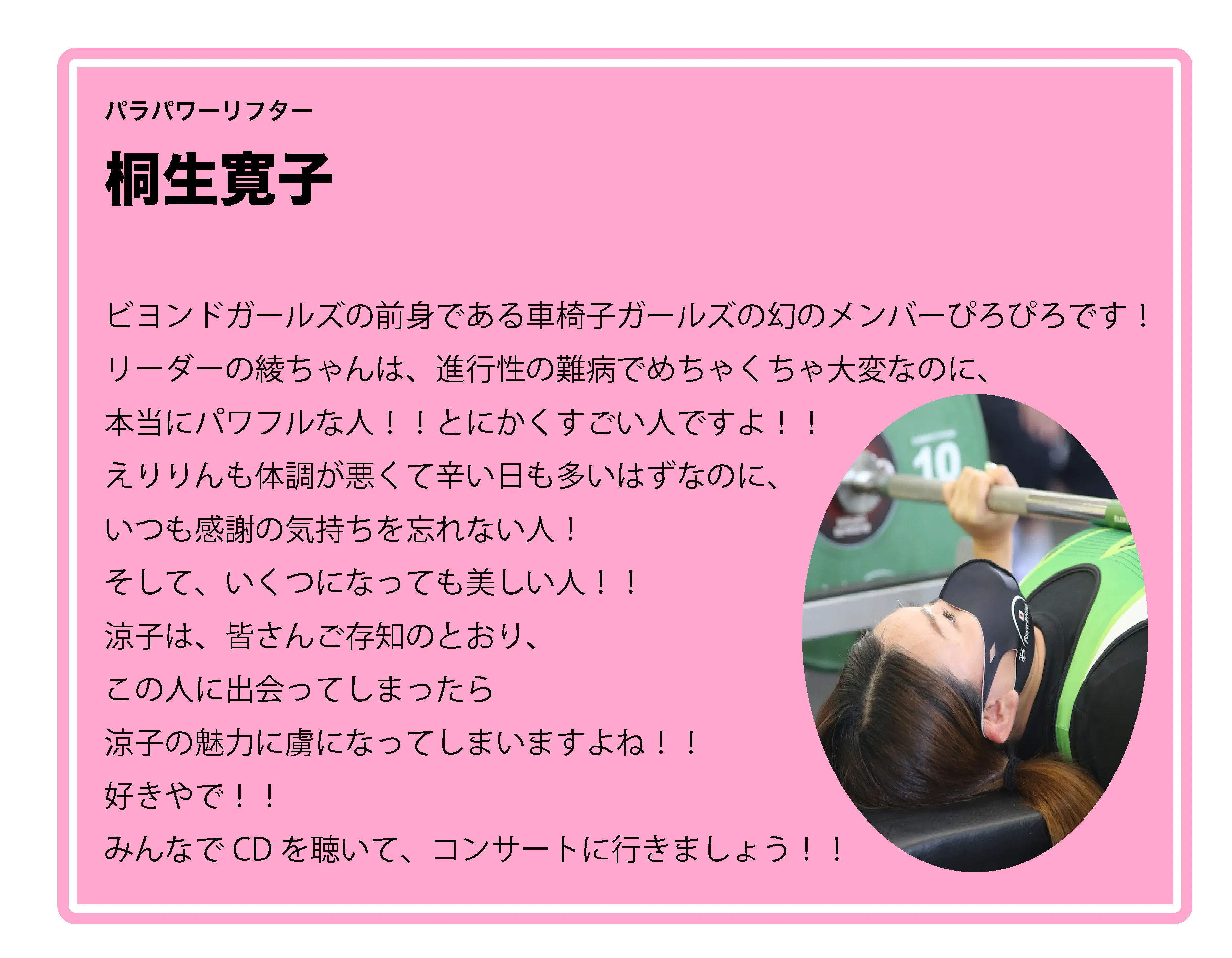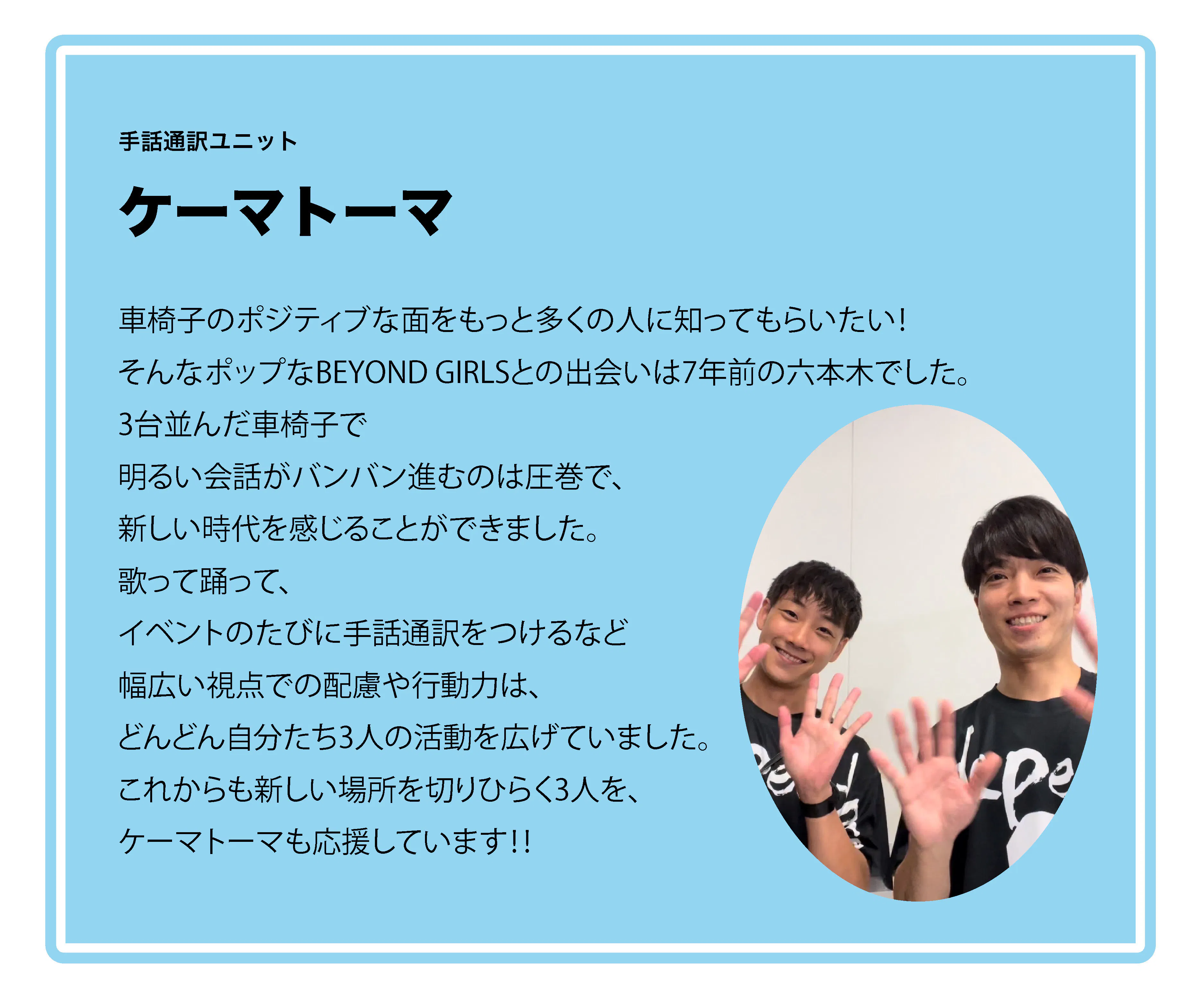 「BEYOND GIRLS」は、車いすで生活する私たちが、「障がい」という枠を超えて、あらゆる可能性に挑戦し続けるチャレンジユニットです。