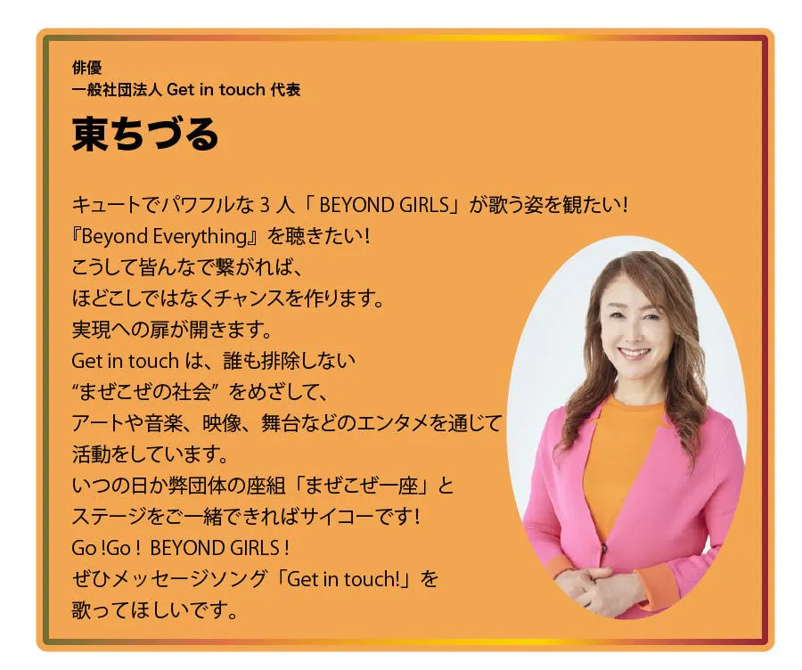その後活動は広がっていき、3人に限らず、BEYOND GIRLSとして歌やダンス、講演活動に挑戦してみたいと志願して下さった様々な方々と共にBEYOND GIRLSプロジェクトとして活動を共にしてきました。