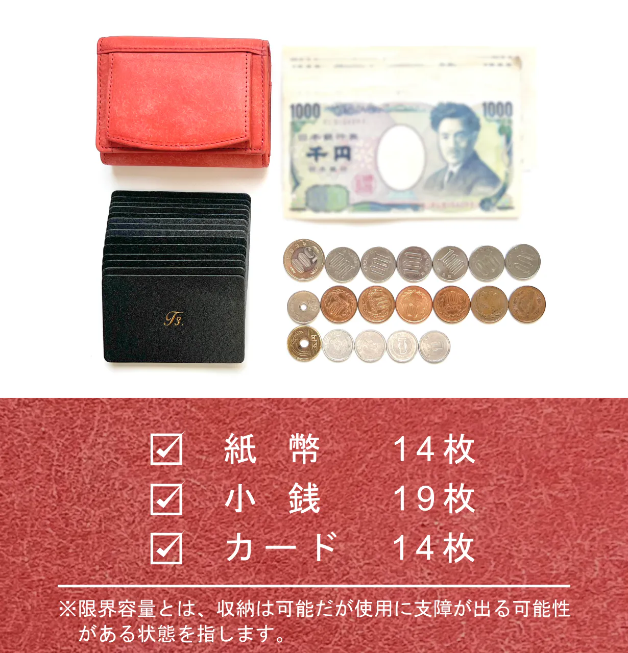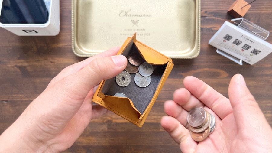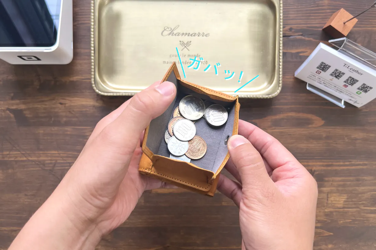 折り紙のように折り畳まれたマチがガバッと開くボックス型の小銭入れは中身が一目瞭然!