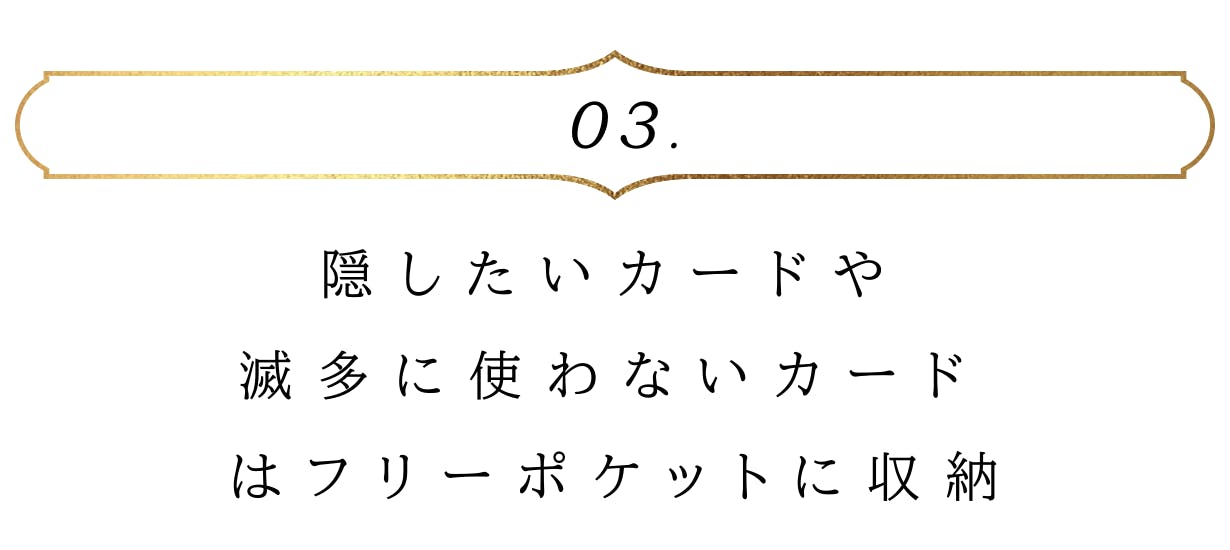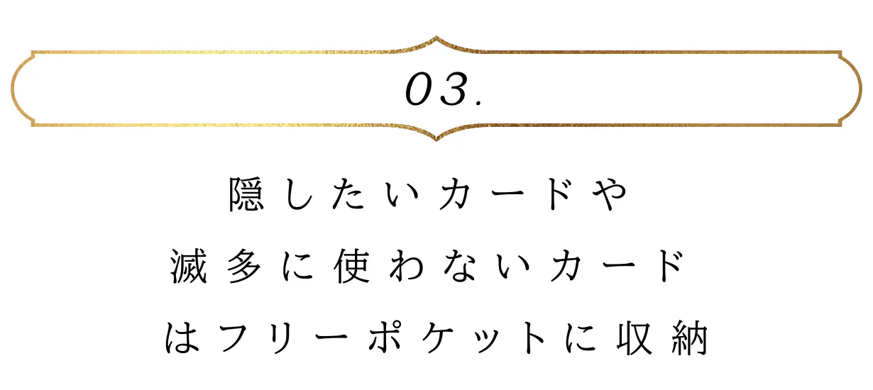 3箇所あるフリーポケットは深めの設計。カードがスッポリと隠れるので、見せたくないカードを収納するのに最適です。