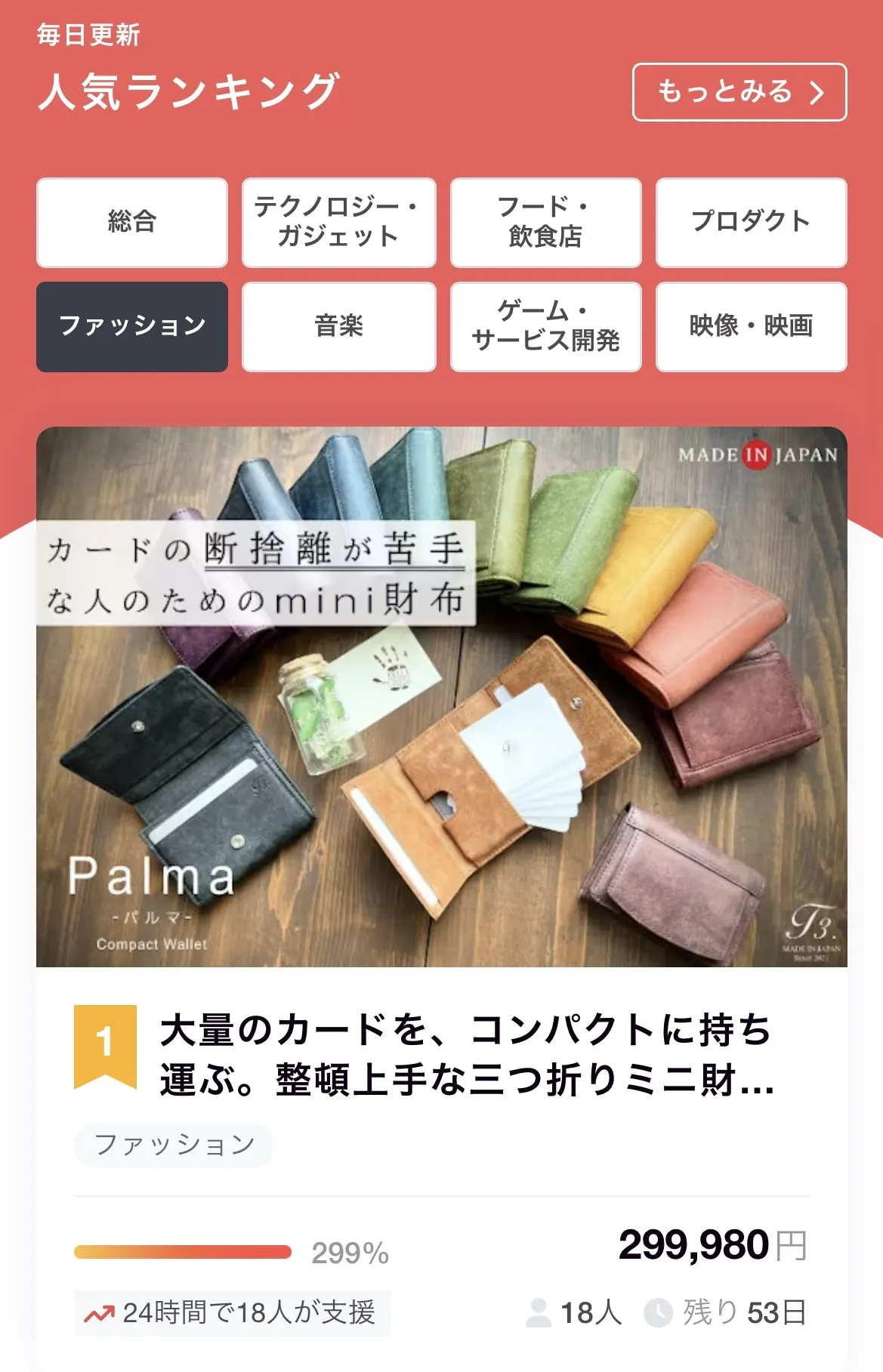 2024/12/24 17:03支援者様、支援をご検討中の皆様こんにちは!T3. Palmaプロジェクトチームです。本日の10時よりプロジェクトを公開させていただきましたが、多数のご支援により早くもプロジェクト達成となりました!また、驚いたことにファッションカテゴリランキングの1位にも輝いておりました!!!数多くのご支援をいただき、スタッフ一同心より感謝申し上げます!本当にありがとうございます!!支援金の使途につきましては、リターンの製作だけでなく、既存の製品のブラッシュアップや新商品の開発費としても活用させていただきます。より素晴らしいプロダクトを世に送り出し、皆様の生活を豊かにすることで還元できればと考えております。引き続き、応援よろしくお願いいたします! もっと見る