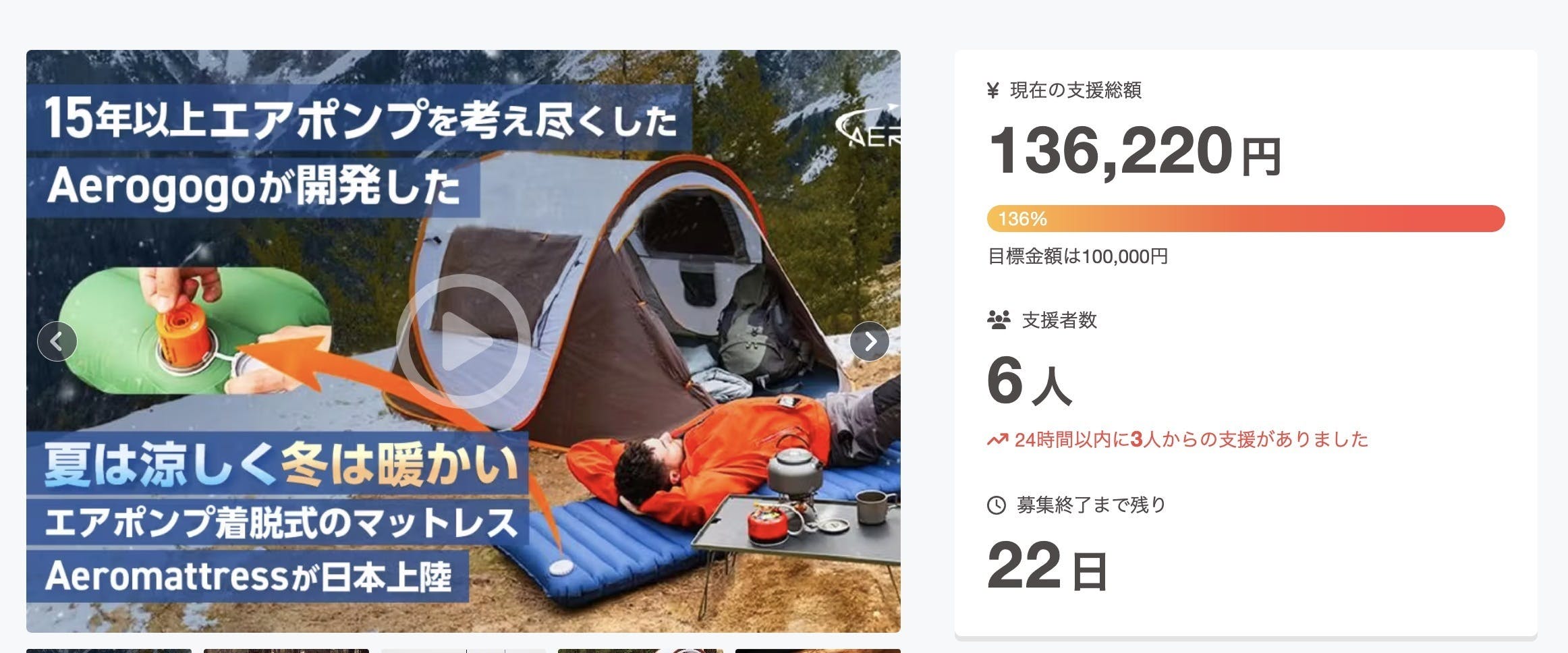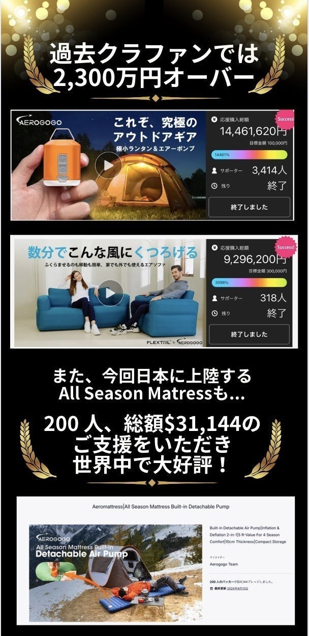 2025/01/31 17:30こんばんは!AeroGOGO JPです。この度、、、目標を達成することが出来ました!!!本当にありがとうございます。AeroMattressは、外部電源が不要で保管や移動で場所を取らず、さらには人間工学に基づいた設計をしているので、首、肩、腰などが痛くなりません。更には特殊素材を3層にしているので、冬は暖かく、夏は涼しい快適な寝心地です。私たちが15年かけて作り上げた、結晶を日本でも大きく広げられてとても嬉しく思っています。この目標を達成できたのも、あなたが興味を持ってくれたお陰です。ただ、ここはスタートラインだと思っています。このプロジェクトを更に伸ばして、世界中のアウトドアファンにAeroGOGOの品質を伝えることで、自然を愛し共に過ごす素晴らしさを支えさせていただきたいです。まだ、プロジェクトは1ヶ月弱残っています。その全てを全力で走り切る所存なので、どうか応援、ご支援のほどお願い申し上げます! もっと見る
