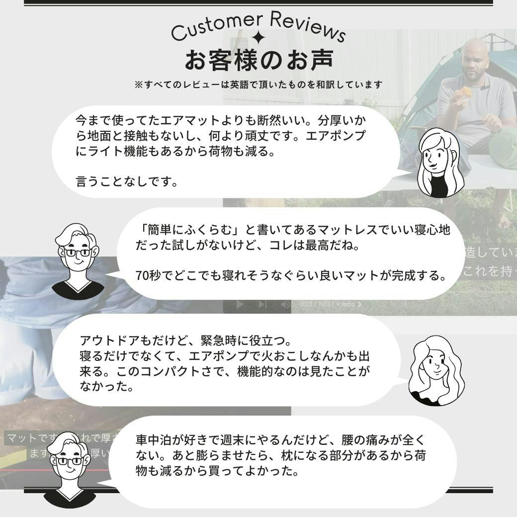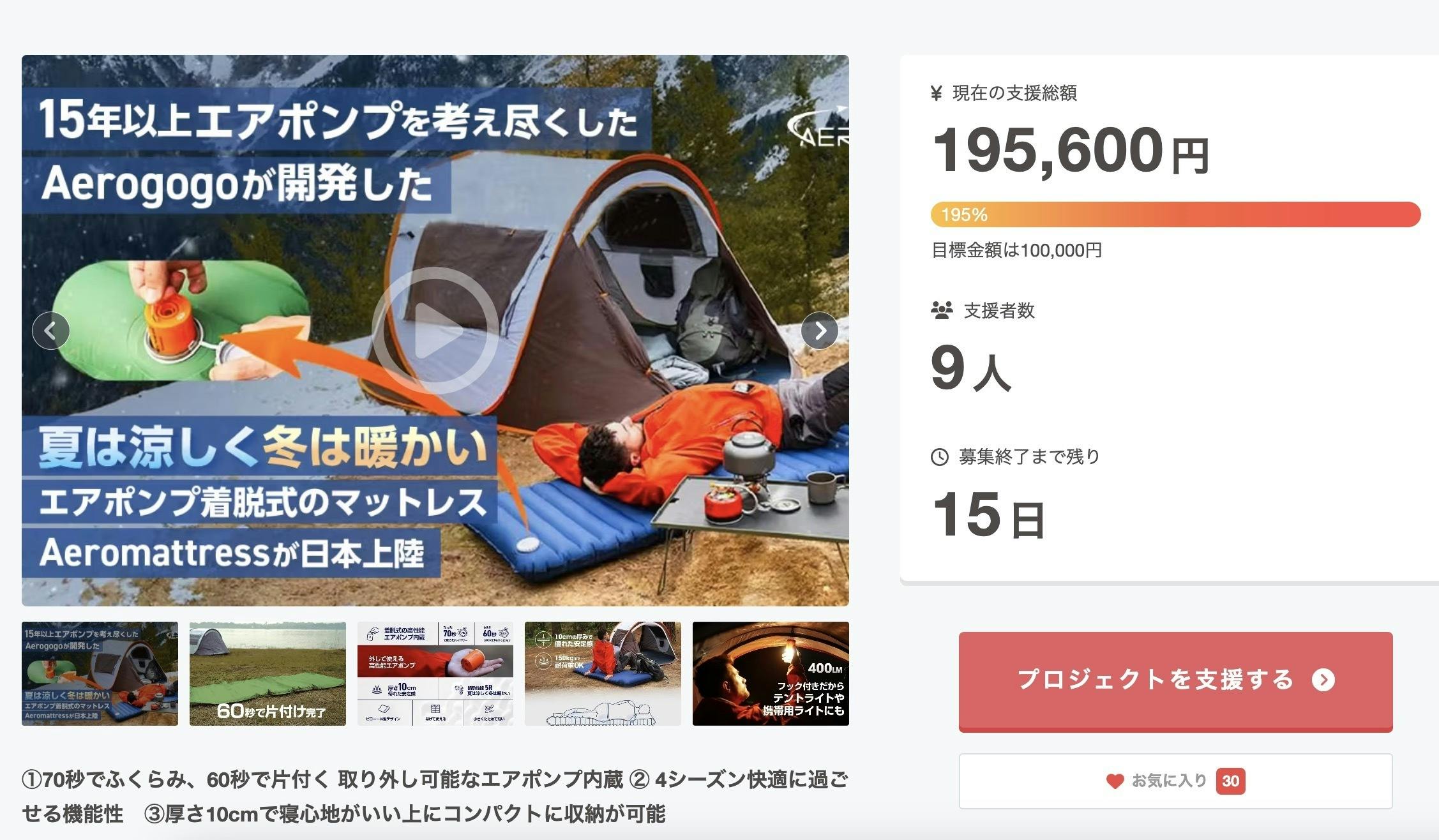 2025/02/07 07:23Campfire様のニュースレターに掲載いただきました!本商品が多くの方の目に留まる機会を頂けて、嬉しい限りです!そして...達成率が195%までいきました!!!!私にとってこのマットレスは人生を賭けていると言っても過言ではありません。アメリカでうまくいってるものでなく、ともに苦楽をともにした仲間と一緒に作り上げたものですので、本当に嬉しい限りです。このエアマットレスは、私たちが15年の年月を費やして制作し、アウトドアを愛する人が欲しいものを全てを詰め込んだと自負しているエアポンプを活用して.....テントや車中泊で身体を冷やしたり、首や肩、腰を痛めてしまうという課題を全て解決する商品です。エアポンプの力でアウトドアを快適にして、あなたが時間やお金、手間を大きくかけることなく、最高の体験をして、、、「また来たい」「次は誰かと一緒に来れるな」「最高の1日だった」と思って貰えるような商品を作っております。目標達成はもちろんのこと、これから本商品の品質を世の中に出していくための第一歩として、ぜひ応援、ご支援のほどお願い申し上げます。 もっと見る