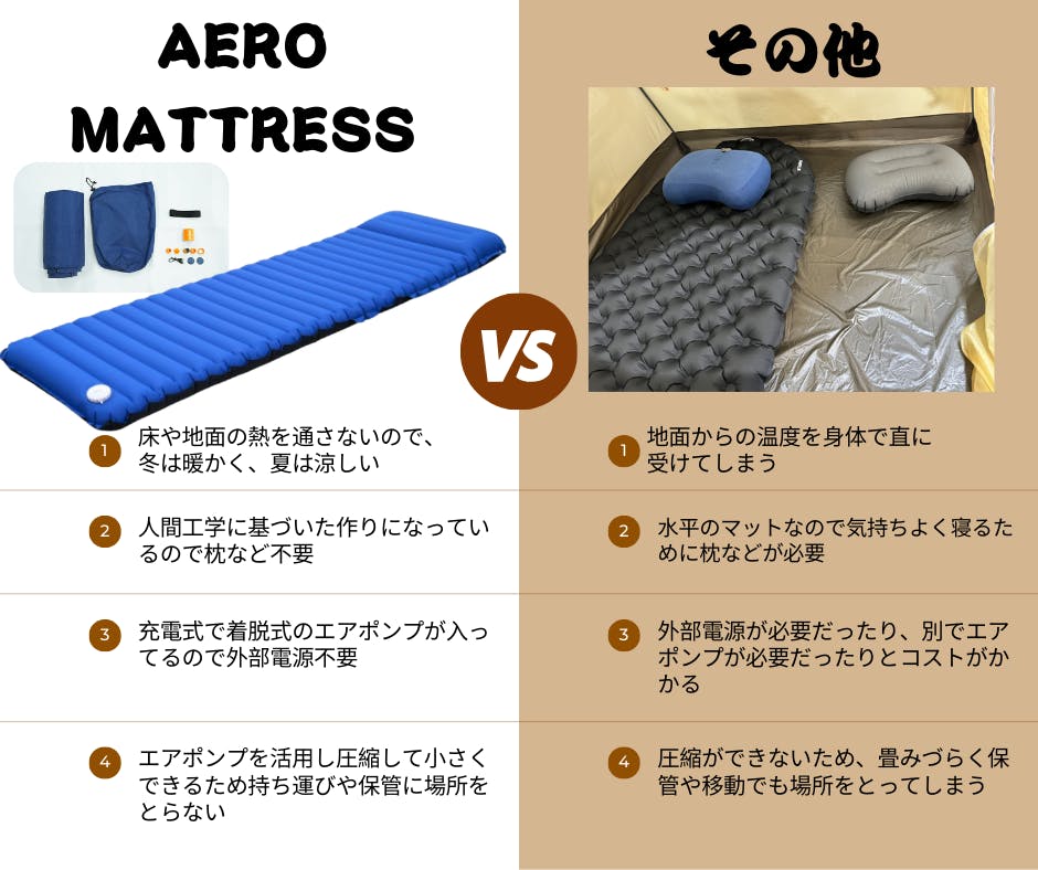 Aeromattress は、マットレス自体にエアポンプが内蔵されており、ワンタッチで膨らませることが可能です。