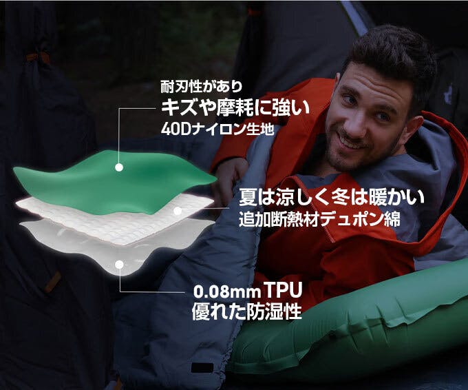 通常のエアマットレスでは断熱性が低く、地面の冷気が浸透してしまうため、夜間に暖かく過ごすのは難しい場合があります。そこで、Aeromattressは3つの異なる層の構成を採用しました。