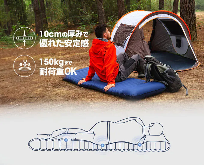 さらに、エアロマットレスの上部に枕構造を内蔵し、寝心地を高めました。この設計により、追加の枕を持ち運ぶ必要がなくなり、キャンプ用品の負担が軽減され、屋外での睡眠のセットアップが簡単になります。エアロマットレスのオールインワンの便利さで、より快適な休息をお楽しみください。