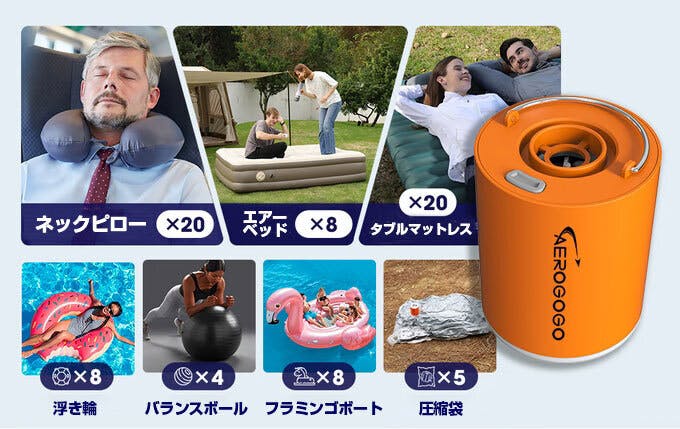 Aeromattress に内蔵された取り外し可能なエアポンプに加え、空気入れが必要な物に対応できるよう5 つの追加ノズルが付属しています。それにより、寝袋、エアベッド、浮き輪、バランスボール、その他の日常または屋外用品の膨らませに使用できます。