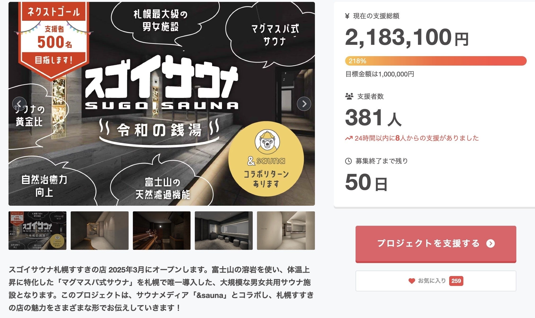 1月31日17時時点で381人の皆様からご支援いただいており、想像をはるかに上回るご支援をいただき、感謝の気持ちと共に、皆様の期待を上回るサウナ体験を提供できるように引き続き関係者一同精進します。