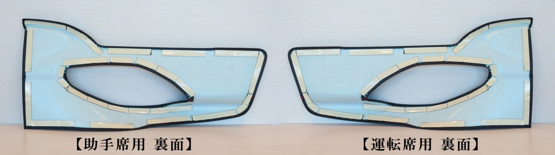 ※冬場や寒冷地では樹脂パネルが硬くなり両面テープが付きにくくなる場合があります。その場合はこの段階で、暖房を効かせた車室内(もしくは住宅の室内)にパネルを放置して樹脂パネルと両面テープを温めておくと付きやすくなります。