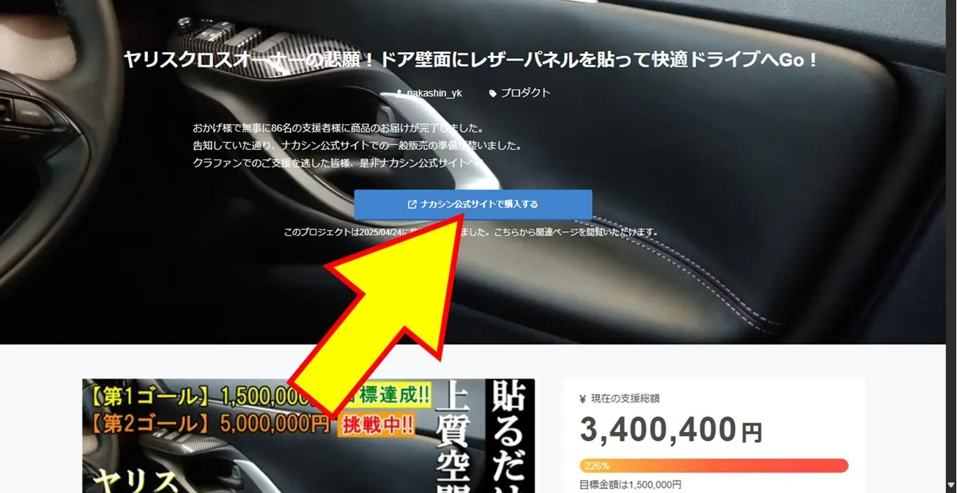 2025/10/17 17:27支援者の皆様へおかげ様で無事に86名の支援者の皆様のもとへパネルのお届けが完了しました。もうお車への取り付けはお済みでしょうか?だいぶ過ごしやすい季節になってきたこの秋の行楽シーズンに、パネルを貼って快適ドライブを楽しんでください!以前こちらでも告知していましたが、いよいよ我が社の公式サイトで一般販売を開始しました!CAMPFIREのプロジェクトページのトップに自社サイトへのリンクボタンを設けました。こちらのボタンから販売サイトへ直でつながって購入出来るしくみになっております。価格は2枚1セット ¥48,000 税込/送料無料 です。身近にヤリスクロスオーナーの方がいらっしゃいましたら是非お知らせください!ナカシン株式会社ヤリスクロス ドアパネル開発チーム一同 もっと見る