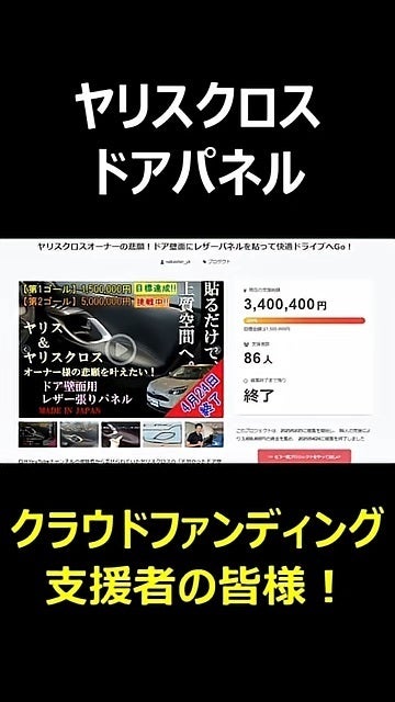 2025/10/17 17:27支援者の皆様へおかげ様で無事に86名の支援者の皆様のもとへパネルのお届けが完了しました。もうお車への取り付けはお済みでしょうか?だいぶ過ごしやすい季節になってきたこの秋の行楽シーズンに、パネルを貼って快適ドライブを楽しんでください!以前こちらでも告知していましたが、いよいよ我が社の公式サイトで一般販売を開始しました!CAMPFIREのプロジェクトページのトップに自社サイトへのリンクボタンを設けました。こちらのボタンから販売サイトへ直でつながって購入出来るしくみになっております。価格は2枚1セット ¥48,000 税込/送料無料 です。身近にヤリスクロスオーナーの方がいらっしゃいましたら是非お知らせください!ナカシン株式会社ヤリスクロス ドアパネル開発チーム一同 もっと見る