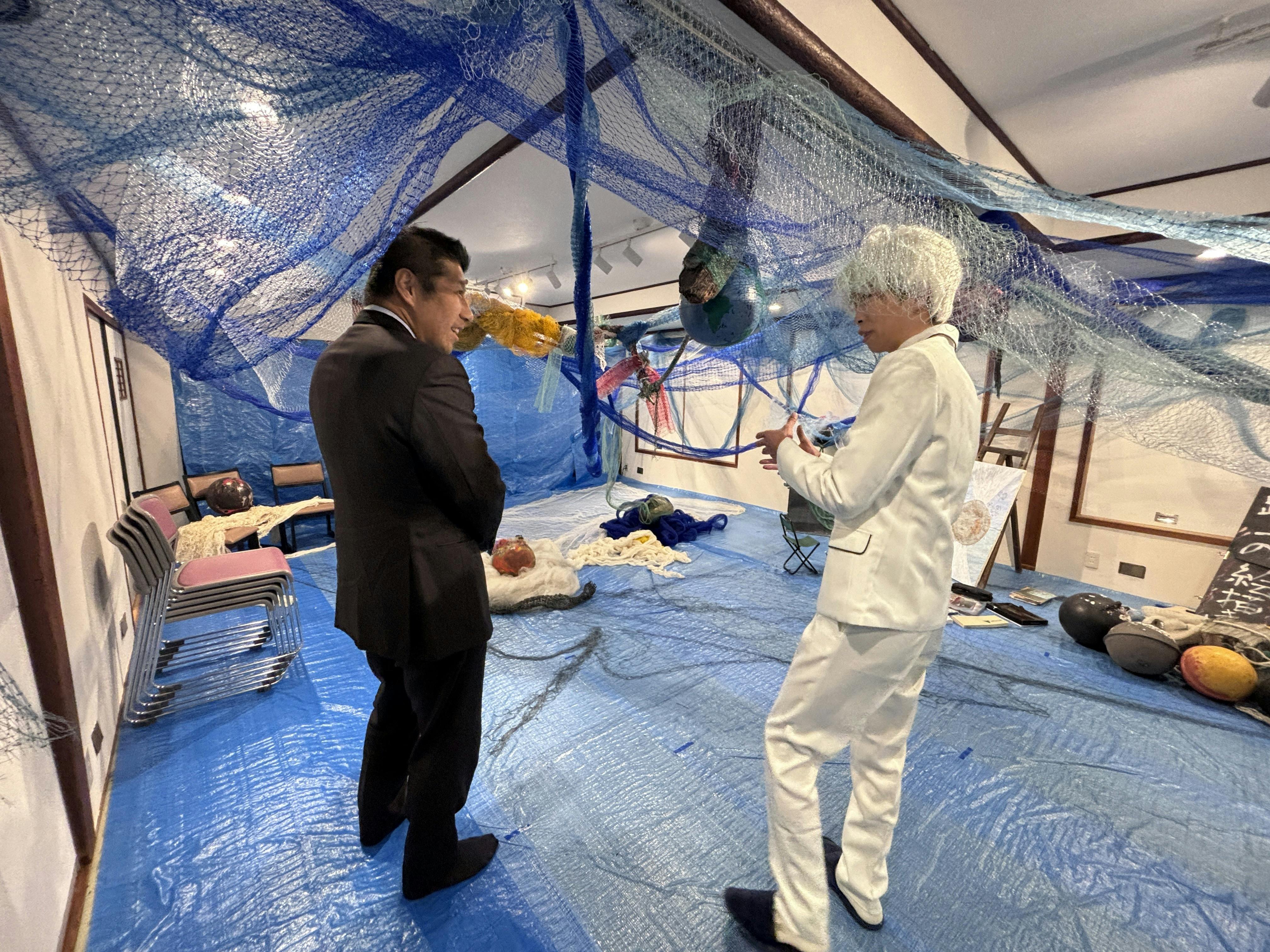 本日1/28には四日市市森市長にもお越しいただきました。四日市のかつての主要産業であった漁網を活用、四日市をテーマに作品制作をしていたおかげか既に知っていていただけていたみたいで嬉しい限りです。