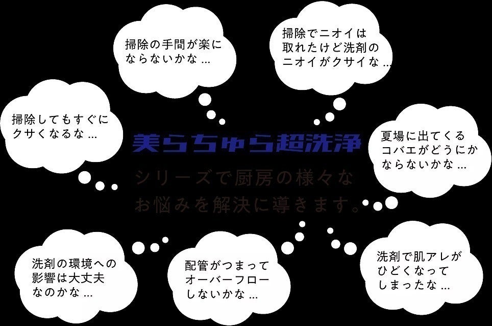 大きな違いは即効性と強力な効果が期待できることです。天然成分を配合した他社製品では効果が薄く即効性も低いですが美らちゅら超洗浄は、投入後数分でニオイ・油・タンパク質の分解がはじまります。他の酵素系洗浄剤にはない即効性と強力な分解効果でお客様の作業環境を整えます。