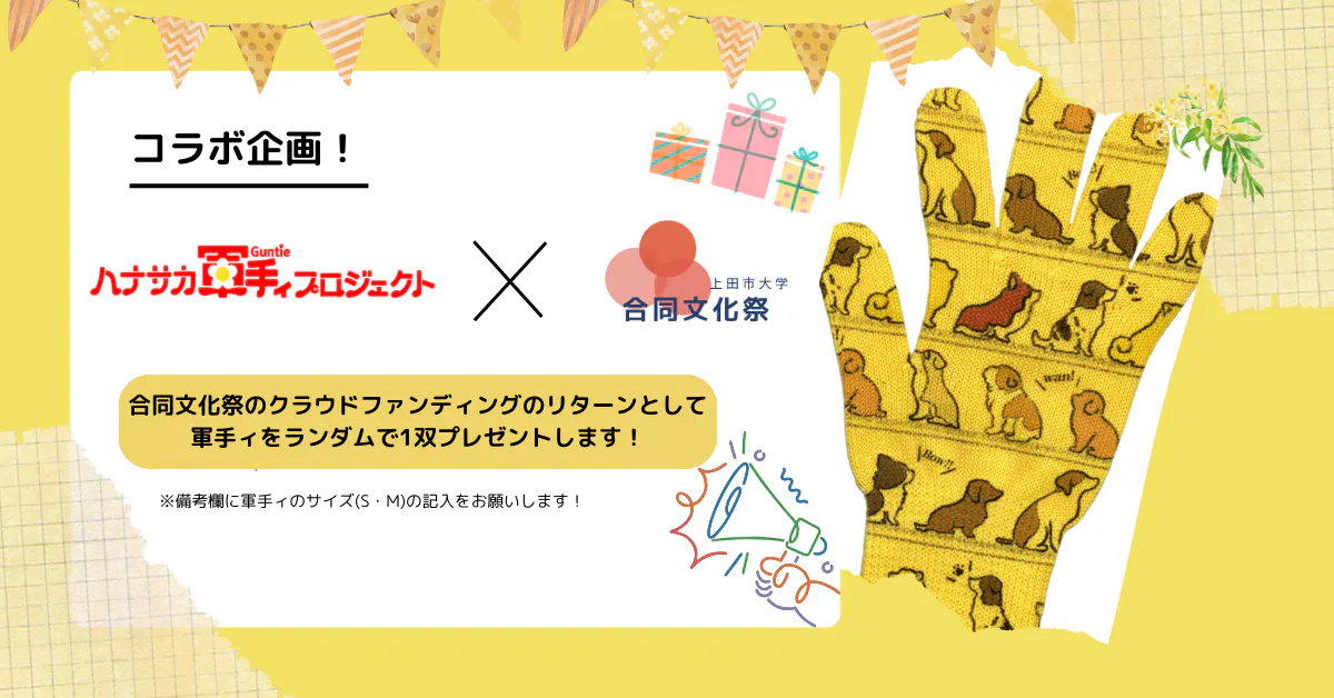 合同学園祭は通常の学祭よりも規模が大きく、多くの準備が必要です。特に資金面では、会場費、設備レンタル費、広告費などをカバーするため、皆さまのご支援が必要不可欠です。リターンについてご支援いただいた方には、感謝の気持ちを込めて、以下のリターンをご用意します。リターンの作成には、信州大学繊維学部の学生団体である、ハナサカ軍手ィプロジェクト様にもご協力いただいております。