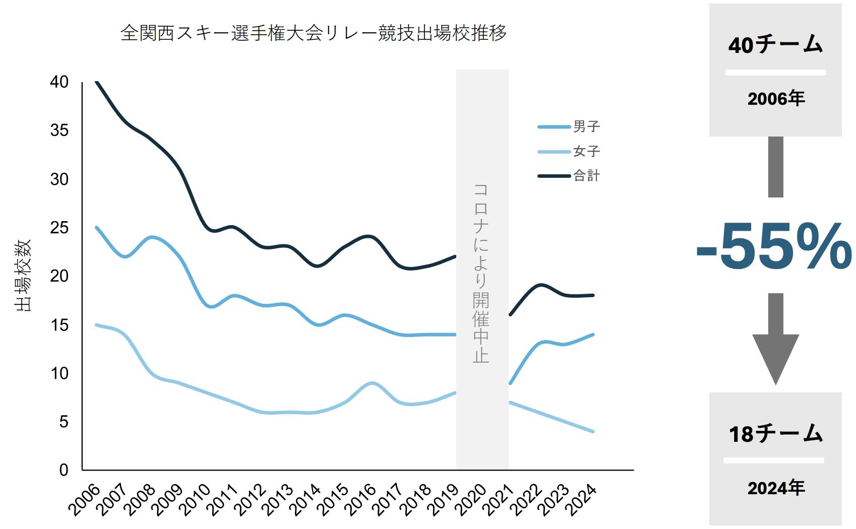 また、一大学に限らず、クロスカントリースキー業界を見ても競技人口の減少が著しく、西日本の大会では20年前と比較してリレー種目の出場校数が50%以上減少しています。