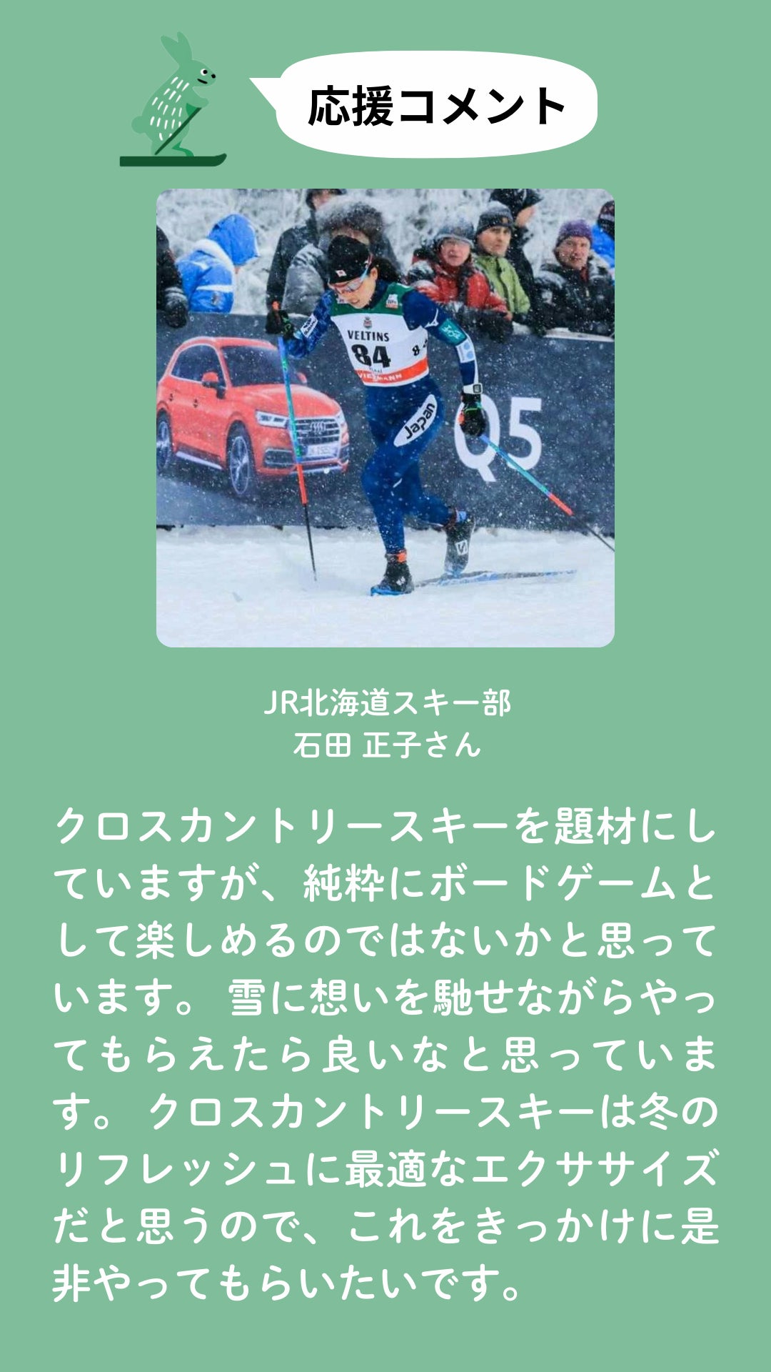 本日、クロスカントリースキー種目において冬季五輪5大会連続出場中の石田正子さんより応援のコメントをいただきました!身に余るお言葉をいただき大変感謝しております。