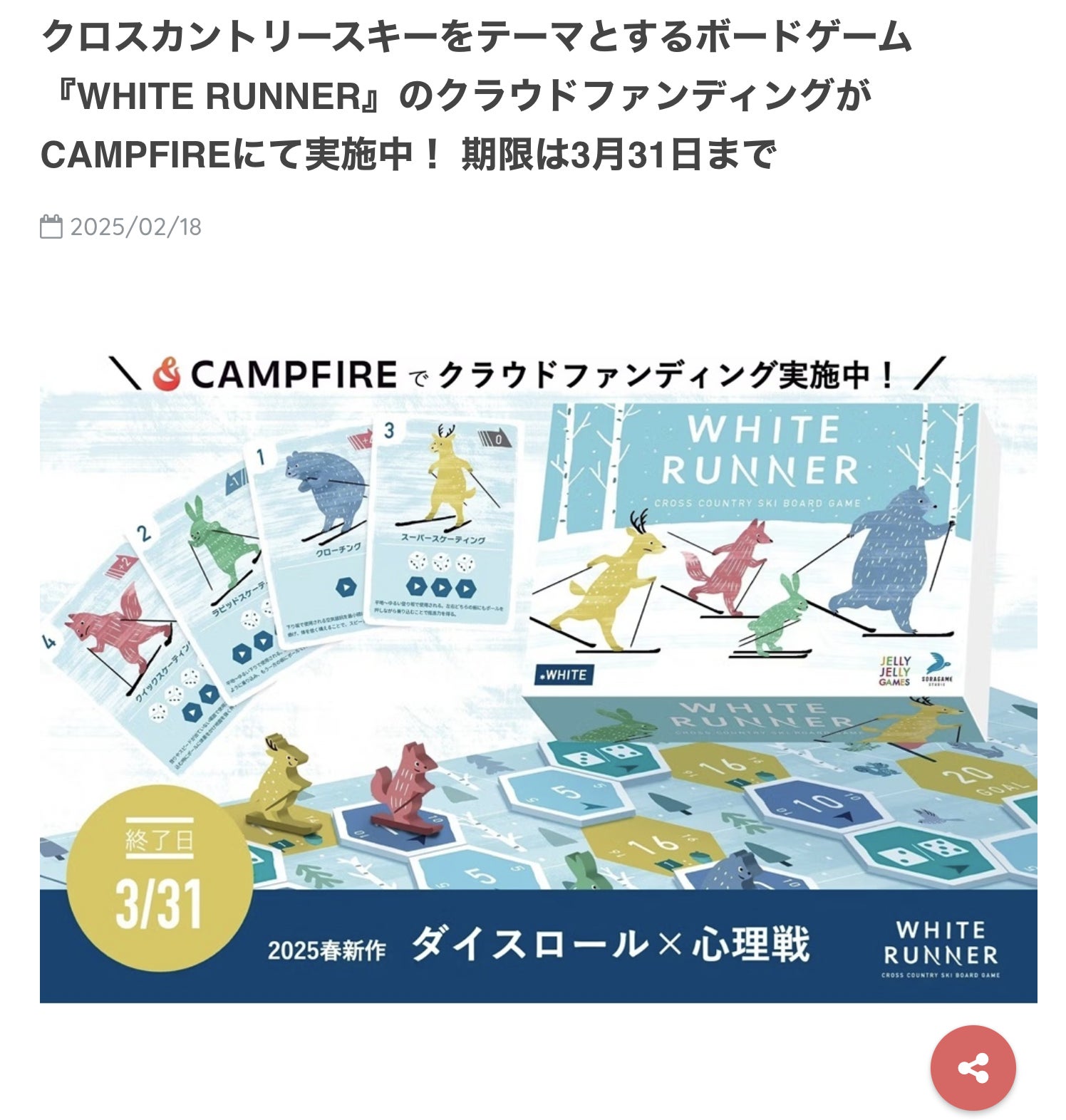 こんにちは!クロカンスキーボードゲーム製作者の濱田です。今週、ご支援人数が100名並びに、ご支援金額が60万円を突破いたしました!いつもたくさんの応援コメントをいただき本当にありがとうございます。引き続き皆様にゲームを楽しんでいただけるように丁寧に制作してまいりますので、周りのご友人で興味のありそうな方がいらっしゃったらぜひシェアいただけますと幸いです。木島平クロスカントリースキー競技場の景色を添えて2025年3月9日 濱田 航平