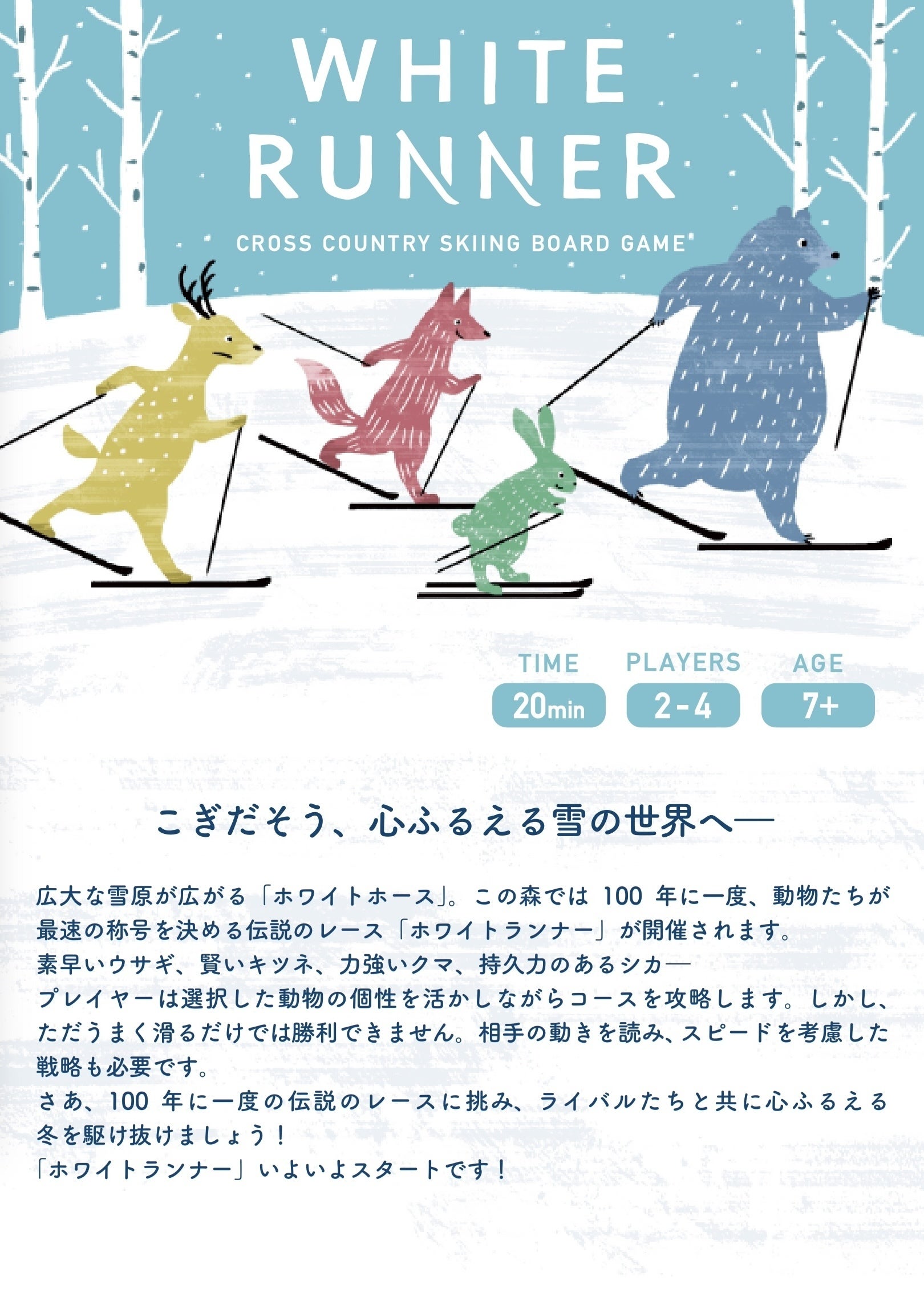 起伏のあるコースを走るように滑るクロスカントリースキー。お家の中で手軽に遊べるボードゲーム。それぞれの魅力を知ってもらいたいという想いから、ボードゲームを制作しました。このゲームはみんなで楽しみながら、クロカンスキーの走り方や心理戦を体験することができます。こぎだしましょう、心ふるえる雪の世界へ!