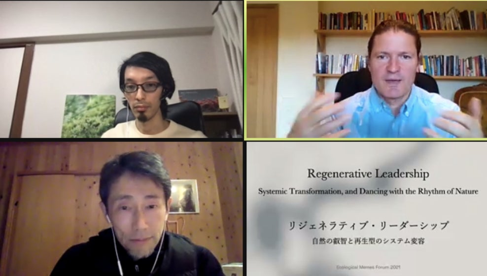 同年3月に開催されたEcological Memes グローバルフォーラム「あわいから生まれてくるもの〜人と人ならざるものの交わり〜」に、共著者のひとりGilesをお招きしました。リジェネラティブ・リーダーシップのエッセンスや本書のコアであるLogic of Lifeについて、Gilesの想いや考えを直接日本とつなぐことがようやく実現した瞬間でした。