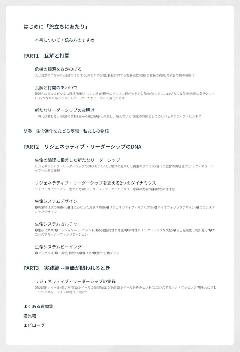 本書『リジェネラティブ・リーダーシップ』は、急激な変化や高まる複雑性に適応しながら、生命の繁栄に貢献しようとする先駆的なリーダーたちの実践や在り方をもとに、生命システム論に根差した独自のモデルとして体系化されたものです。