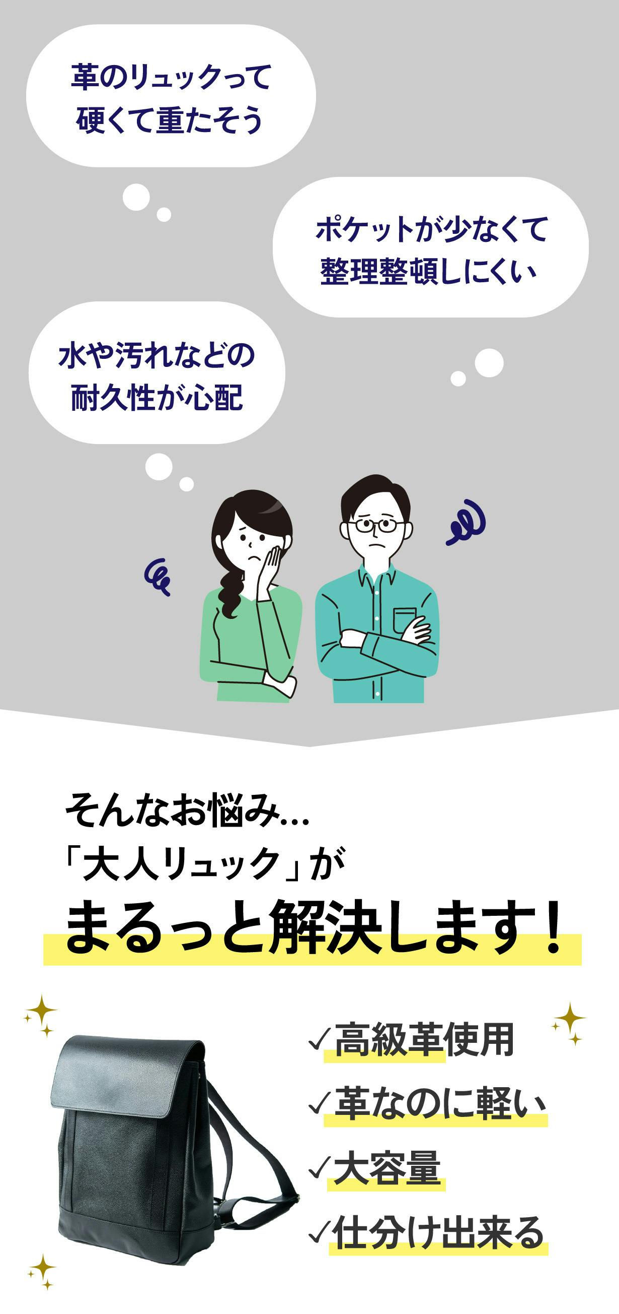 「大人リュック」にご興味を持っていただき、ありがとうございます。僕たち新進工房は若手革職人のグループです。斜陽産業と言われている日本の革職人業界を少しでも盛り上げたいと考えています。バッグは機械で作る事が出来ません。一つ一つ、職人の手によって作られています。人の温かみがこもった商品をお届けできればと思います。
