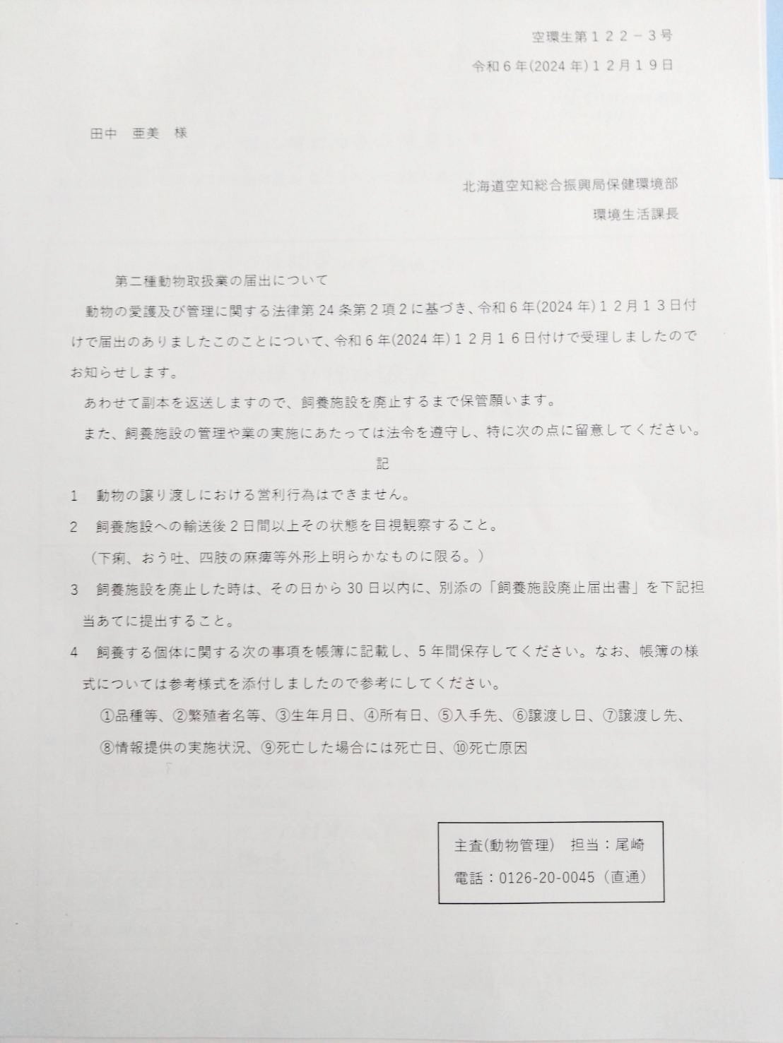 現在第二種動物取扱業申請中→令和6年12月16日、北海道空知総合振興局に受理されました