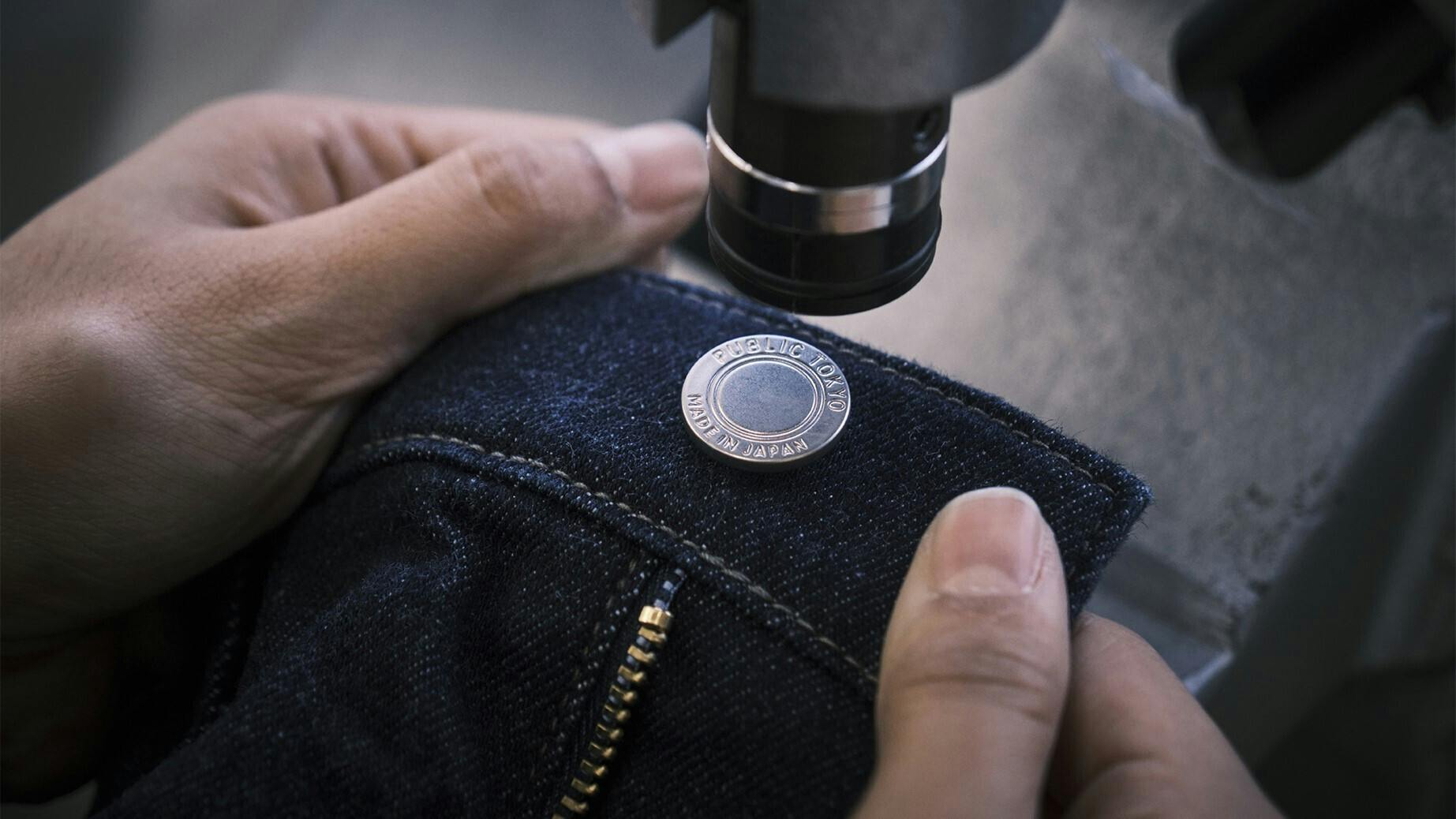 レザーパッチ・ボタン・リベットなどを取り付け、完成させる最終工程。