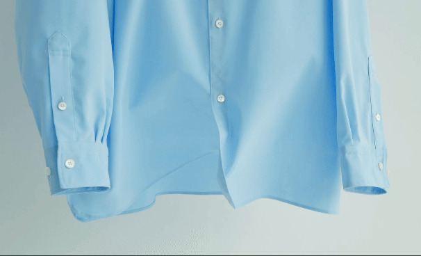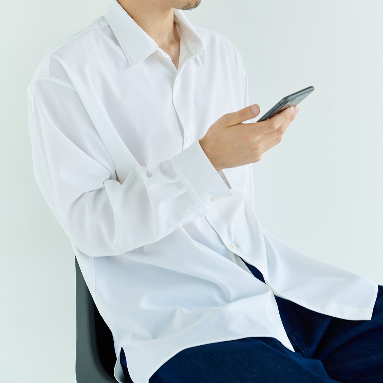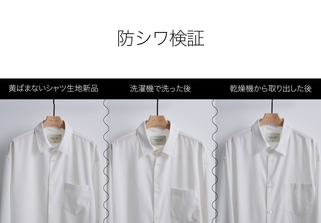 シャリ感が強く硬いポリエステルの風合いを、柔らかくシルキータッチにすることができ、滑らかな素材感が生まれます。さらに、黄ばまないシャツの生地で洗濯、乾燥をおこなったところ乾燥後にシワはほぼ入っておらず、ノンアイロンで綺麗な状態に戻る機能面も兼ね備えています!