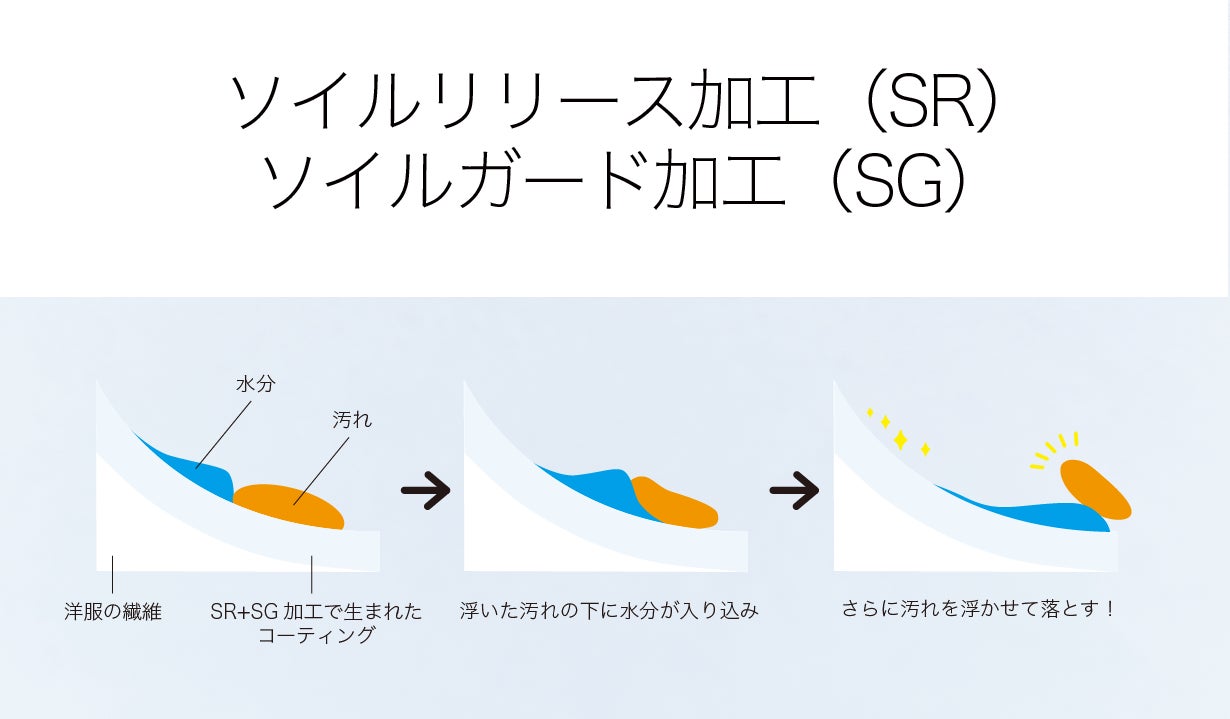その為、洋服に含まれた水分を乾きやすくする生地となります。※吸水速乾のデータは生地にSR、SG加工がされているため検査不可、あくまで素材の特徴です。