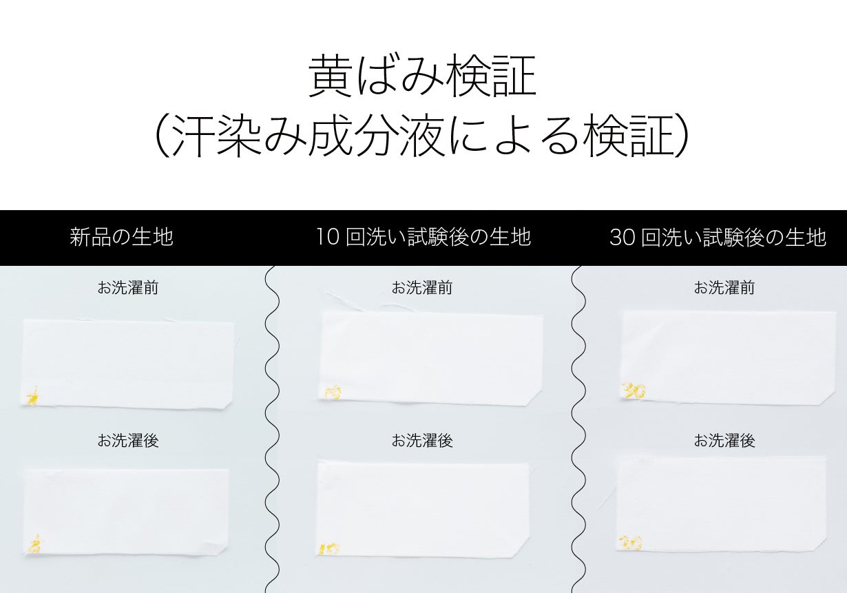 同じような布が並べられていてわかりづらく申し訳ございません。(笑) しかし、この変化の無さが"黄ばみにくい"ことを証明しています!SG加工により、そもそもほぼ汗染み成分は付着せず10回、30回と洗った後でも効果は持続しました!シャツで一番の悩み事もこれで解決です!