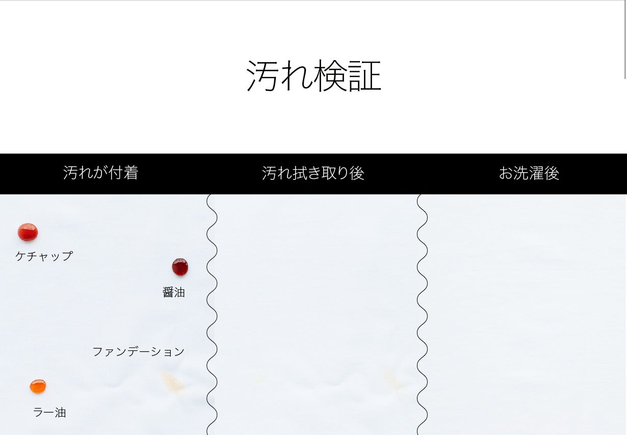 ティッシュで拭き取っただけで付いていた汚れが簡単に落ちました!洗濯後は何も残っていません!ラーメン、トマトパスタなどの洋服に飛び散りやすい食べ物などにも、もう悩まされることはありません!前回プロジェクトの黄ばまないTシャツではワインは落とすことが出来ませんでしたが、今回のシャツではワインもこの通りです!