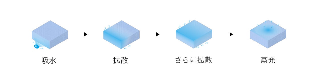 微細な凹凸により、生地にした際に繊維間に微細な空隙を形成するため、お洗濯時などは水分を吸い上げ、拡散して蒸発しやすくさせることができます。▼上記の図