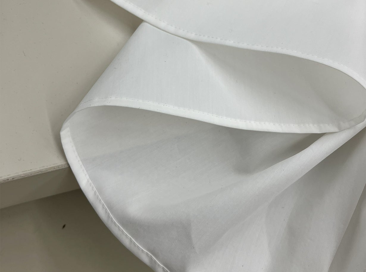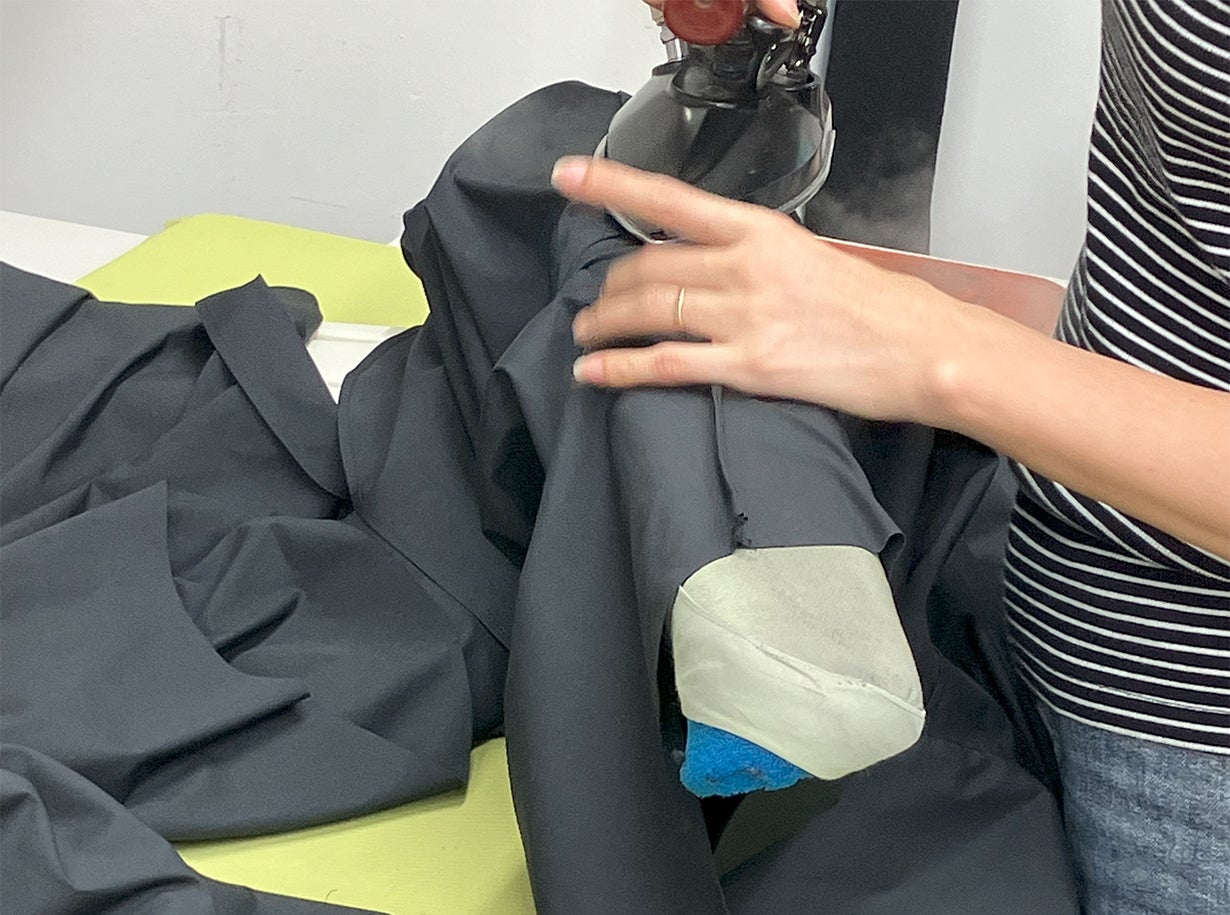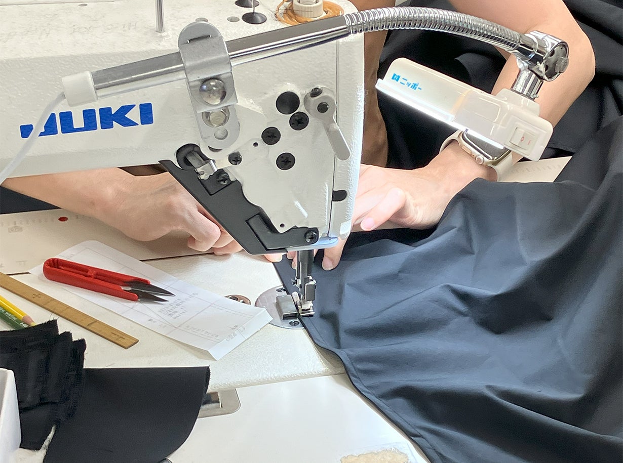 生地が繊細な中で、生地に傷を少しでもつけないように最新のミシンを使用しました。今回のような落ち感の強い生地(滑らかな生地)は縫製がとてもデリケートで難しく、縫いをまっすぐ綺麗に行い縫い接ぎを極力減らすことで完成品の表情を上品に仕上げております。さらに袖ぐりに合わせたアイロンも大変難しく、少し変わるだけで完成品のクオリティは段違いに変化してしまいます。