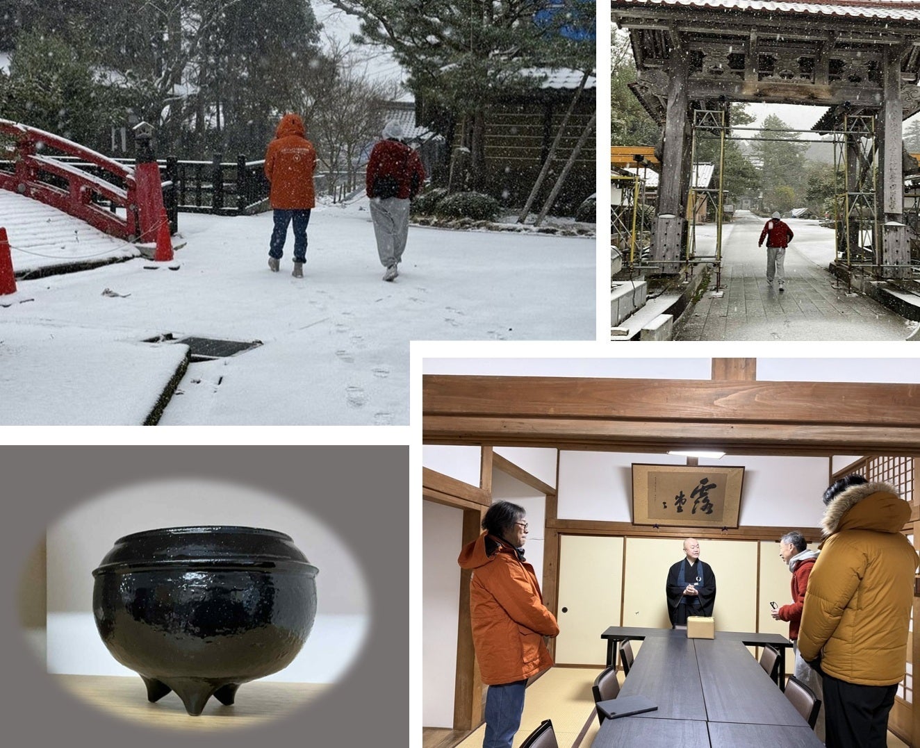 以前の報告時に、總持寺祖院の瓦を「香炉」に再生するというお話になり、今回に至っています。雪の總持寺祖院は静かで、夏とはまた違い、とても落ちつく風景が広がっています。しかしながら、地震の爪痕はまだ残ったまま…文化財の修復にはいろいろな手続きもあり、時間がかかっているようでした。