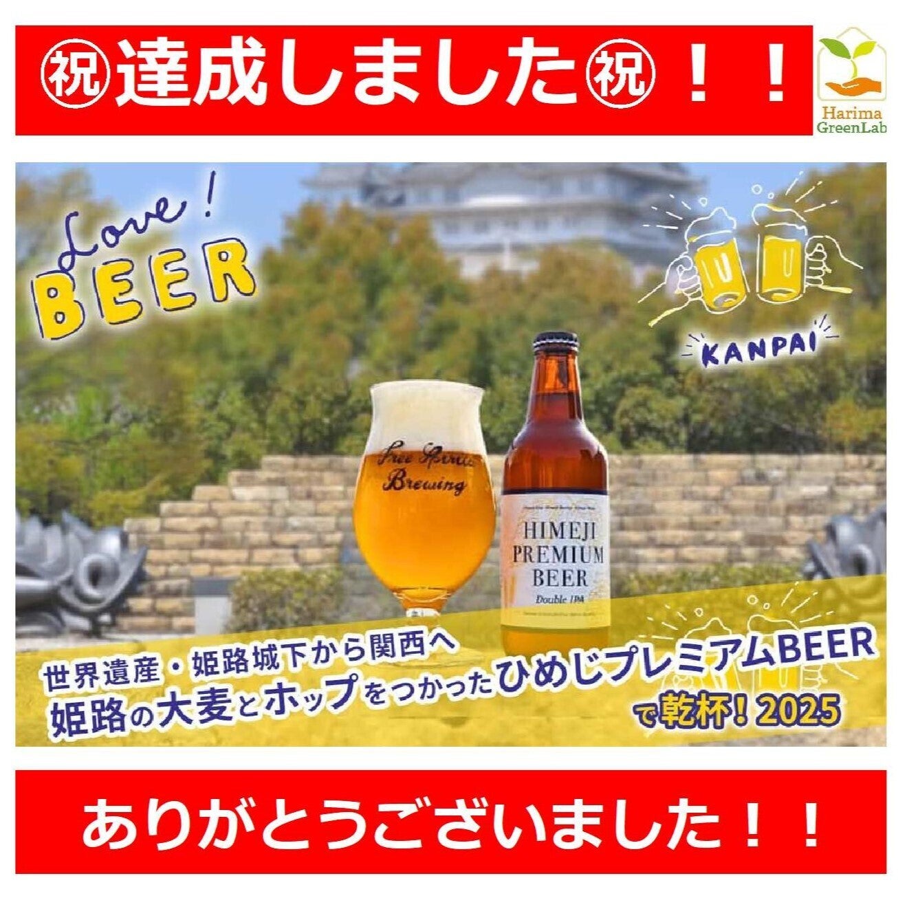 2025/03/01 10:47クラウドファンディング達成いたしました!https://camp-fire.jp/projects/815151/viewご支援いただいた皆様、たいへん有難うございました!思えば、「世界遺産・姫路城下から関西へ」!姫路の大麦とホップをつかった「ひめじプレミアムBEER」で乾杯したいと思って取り組んできました!醸造で使い終わったモルトは、廃棄せずに、ホップの畑やモルトパンの製造に使う、アップサイクルの仕組みこそ、世界に発信できるプロジェクトだと思っております!この仕組みを、ひょうごフィールドパビリオンの認定を気に、大阪関西万博にて出展が決定しており、世界に発信したいと思っております!ご支援いただいた機会を活かし、いよいよ本格化させていきます!支援頂いた資金は、大事に大事に、ひめじプレミアムBEERの醸造費に活用させて頂きます!世界に広げていきましょう!日本のアップサイクルの和!ご支援頂いた皆様とともに!https://camp-fire.jp/projects/815151/view もっと見る
