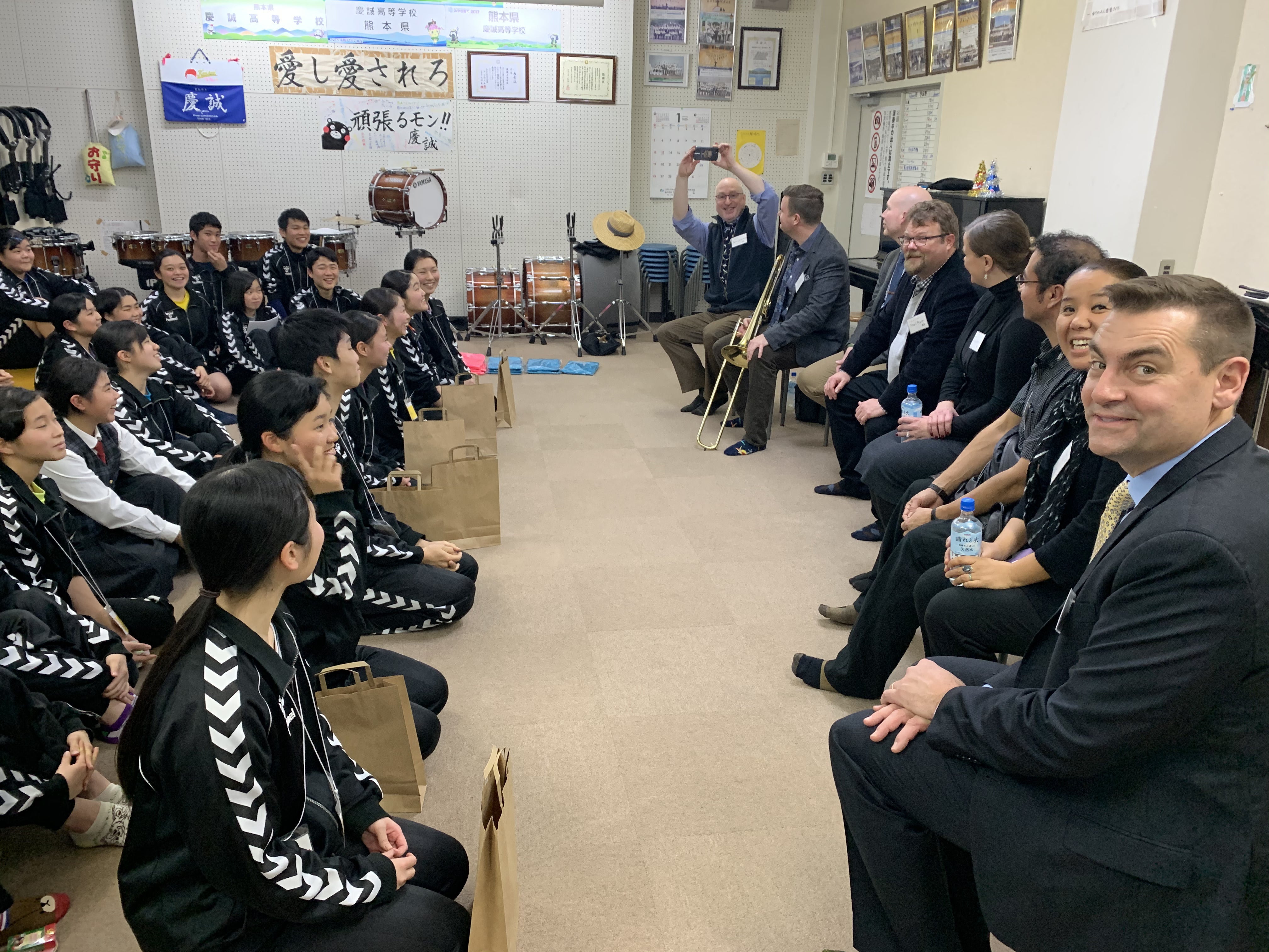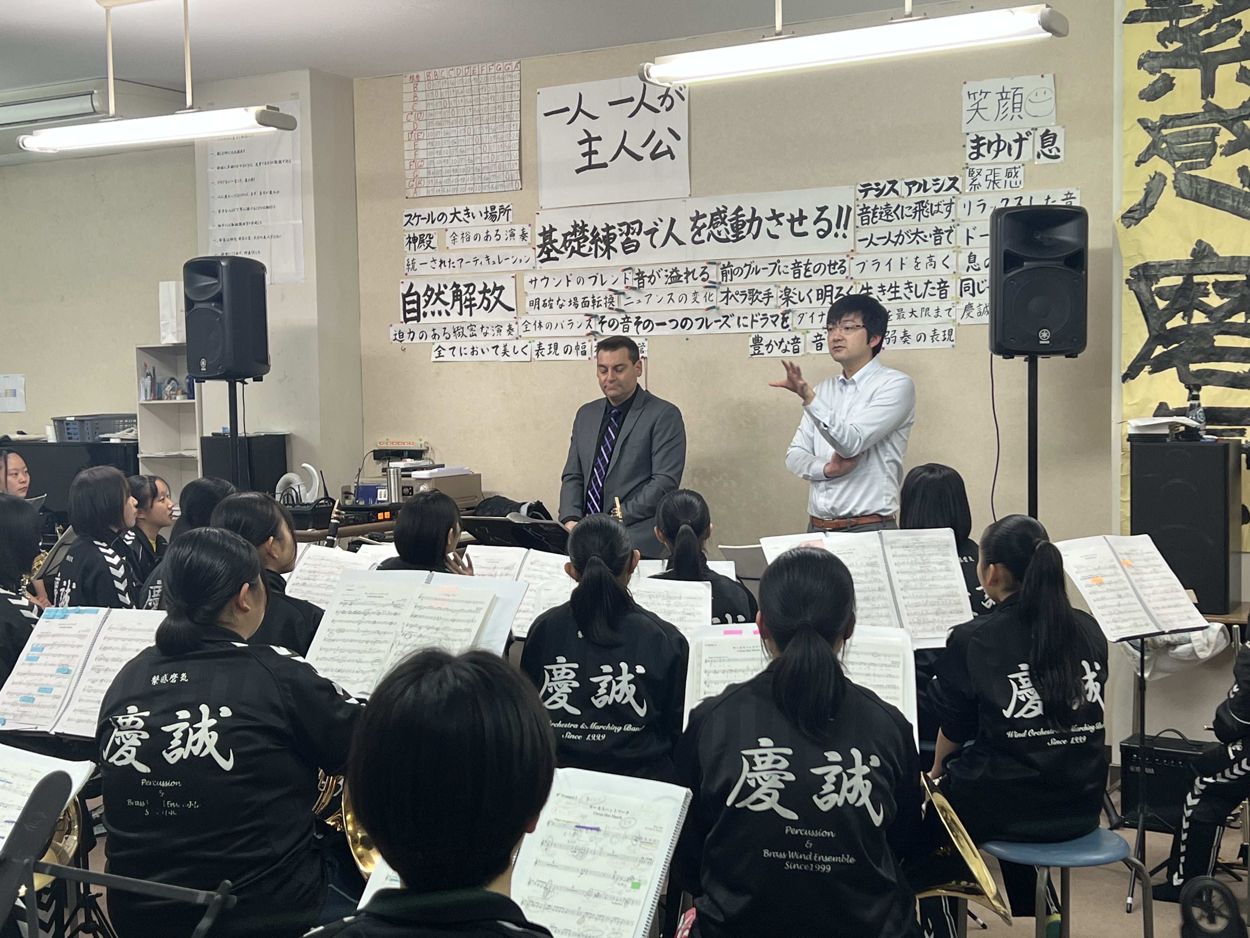 2020年、Lewis Norfleet氏(ルイス・ノーフリート氏) が、日本のスクールバンドの活動を見てみたいという事で来日され、本校吹奏楽部に視察に来られました。まだまだ、活動も演奏も未熟だった私たちに同行されたスタッフ全員で熱心にレッスンまでしていただきました。生まれた国も違う、言葉も通じない、初対面の日本の高校生のために一生懸命レッスンしてくださったあの姿にとても感銘を受けたのを覚えています。まさに、『音楽に国境はない』と感じた瞬間でした。