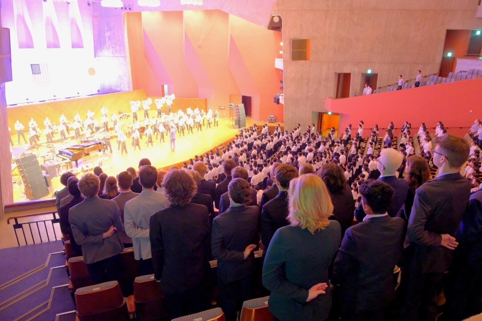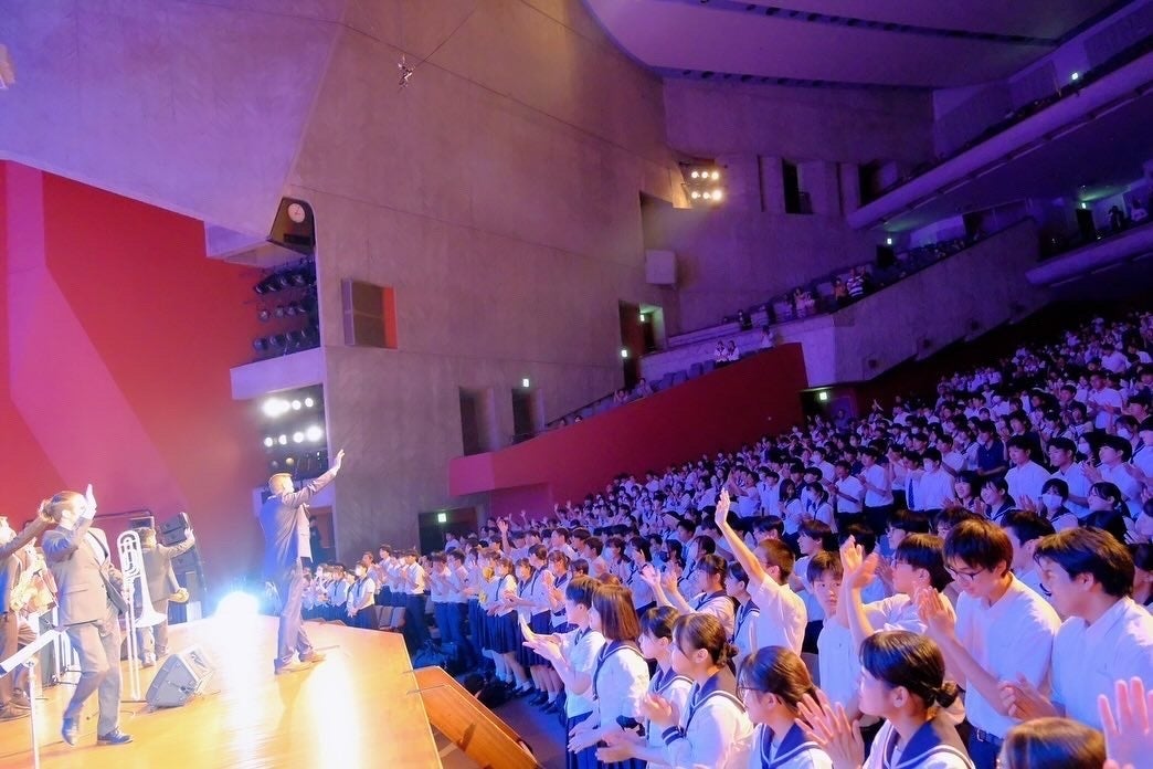 2024年、ついにLewis氏率いるグランツパス高校ジャズバンドメンバー総勢40名が来日し、約10日間本校全校生徒と交流を行いました。全クラスにメンバーが入り、お互いの自己紹介や国の紹介などを行い、プレゼントの交換を行うなど、とても有意義な時間を過ごしました。吹奏楽部もジョイントコンサートということで、全校生徒を観客に、約2時間大熱狂のコンサートを実施しました。グランツパス高校の皆さんの演奏は、日本の高校生とは一味違う演奏で、吹奏楽部員じゃない本校生徒や職員も大興奮の様子でした。こんなに素敵な時間を共有してくれたLewis氏さんをはじめとするグランツパス高校の皆様には感謝の気持ちしかありません。