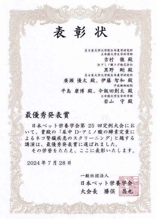 なお、このプロジェクトで使用している技術は、2024年7月28日に開催された日本ペット栄養学会第25回定例大会(一般社団法人 日本ペット栄養学会)にてにて発表され、見事に賞を獲得しました。
