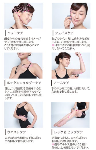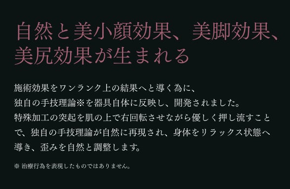 特殊加工の突起を肌の上で右回転させながら優しく押し流すことで、独自の手技理論が自然に再現され、身体をリラックス状態へ導き、歪みを自然と調整します。