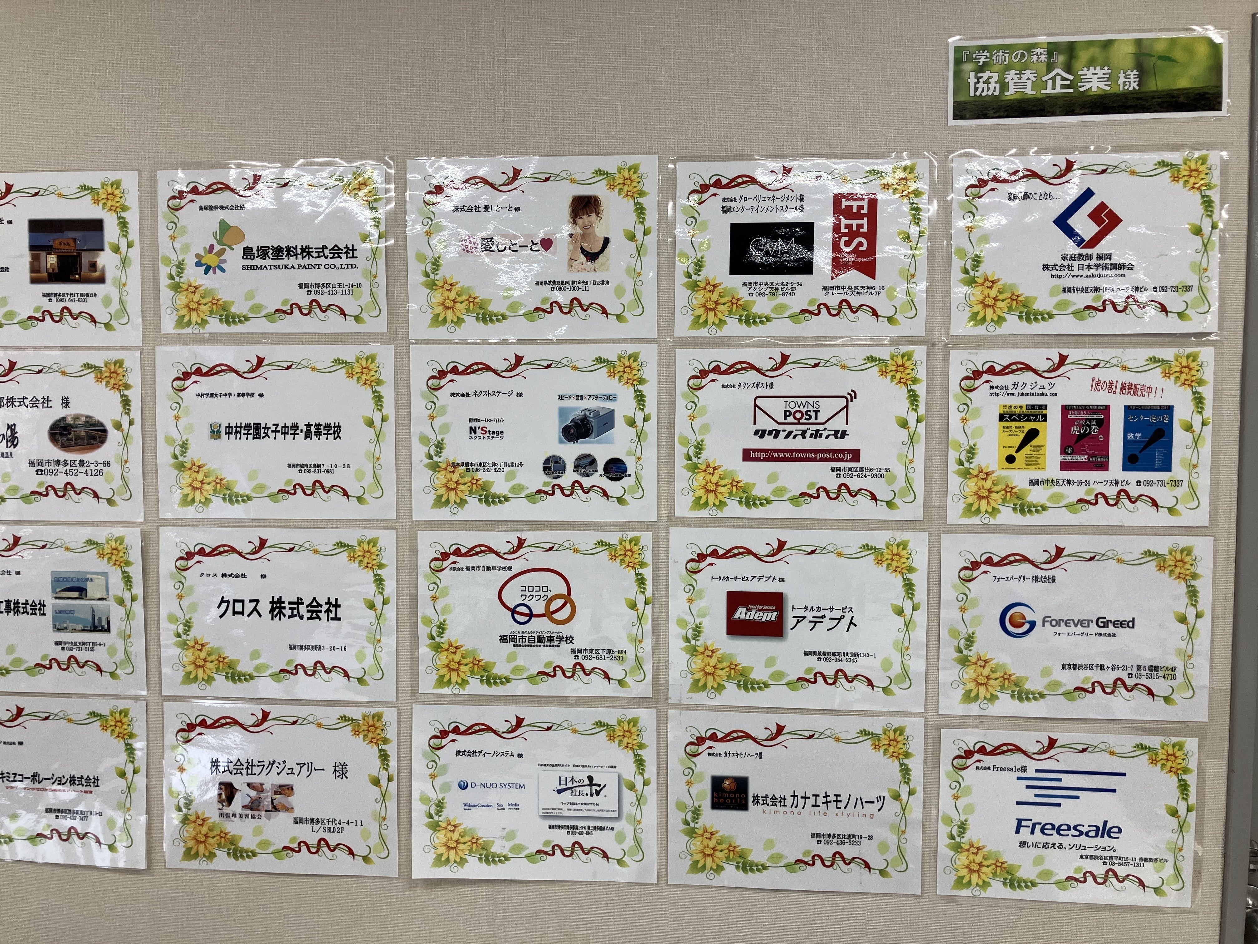 教室内の壁にご支援者様の会社名、お名前を掲載させていただいております!夢の種プラン <3,000円コース>