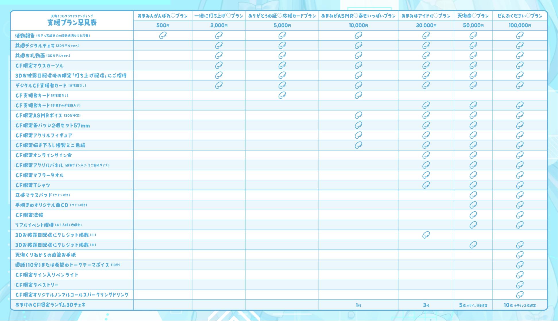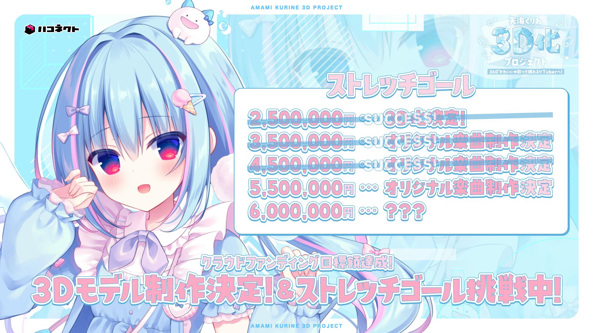 2025/03/17 23:53天海くりね3D化プロジェクトの募集期間が終了し、目標額を大きく超える6,174,000円のご支援をいただきました。沢山のご支援いただきまして、誠にありがとうございます!すべてのストレッチゴールの達成となり、オリジナル楽曲4曲の制作、CDの一般販売、3Dライブも決定となりました。リターン含め、ご支援していただいた皆様に楽しんでいただけるように、精一杯制作に取り組んでまいりますので、また続報を楽しみにお待ちください。※リターンのお届け予定につきまして※システム上2025年8月と記載されておりますが、2025年内にすべてのリターンお届けを目標にしております。変更がある場合には事前にお知らせいたします。引き続き天海くりねへの応援をよろしくお願いします! もっと見る