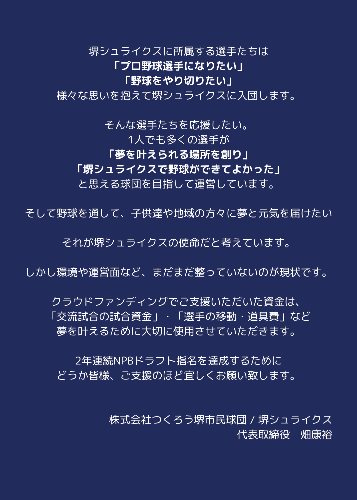 はじめまして。堺シュライクス代表取締役の畑康裕と申します。