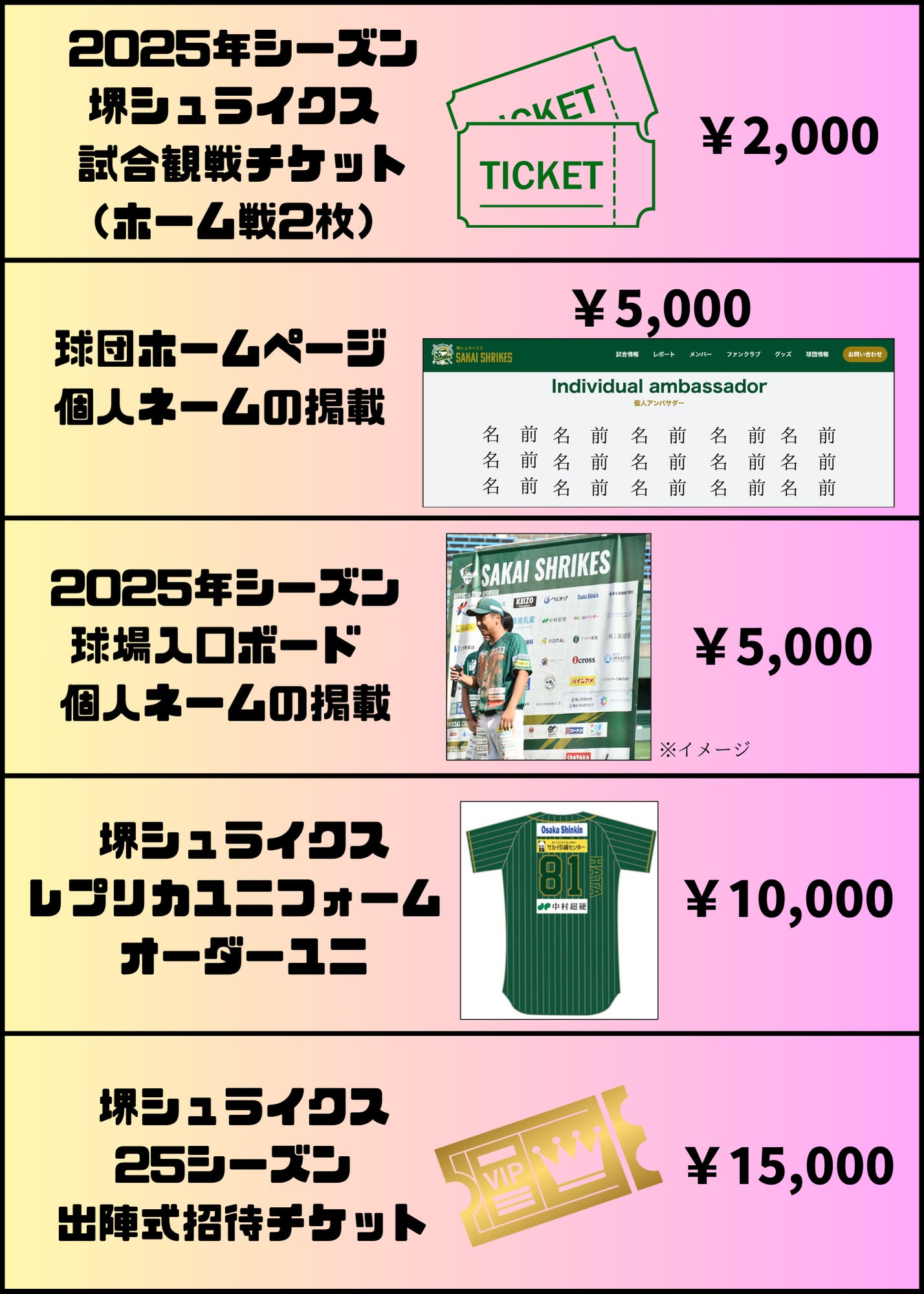 堺シュライクスは、地域の企業様、ファンの皆様による協賛・賛同によって運営が成り立っています。応援していただける企業様・ファンの皆様がいないと、夢を叶えるどころか野球をすることもできません。夢を叶えるためには、ご支援・ご声援がどうしても必要です。