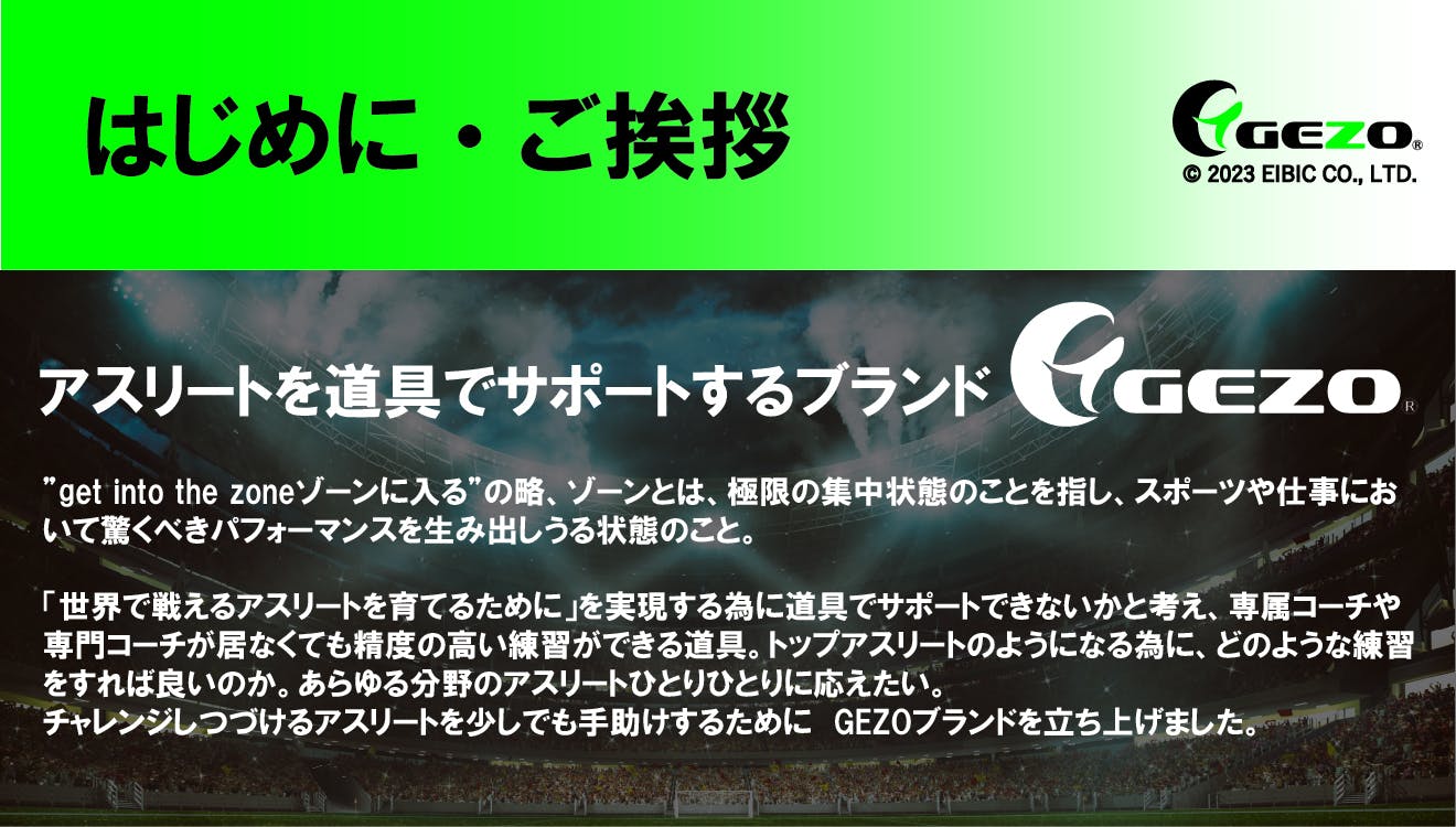 日頃からGEZOをご愛用されている皆様や、我々を応援してくださる皆様に感謝しております。GEZO商品を使用した子供達や選手たちが楽しく練習している様子を拝見しますと、GEZOを作って良かったなといつも感じます。ゴールキーパーの練習では悔しがり何度も挑戦を試みる姿に感動し、サッカーのゴールキーパー向け商品から商品展開しておりますが、今後はサッカーのみではなくスポーツに関わる全ての人の為になる物やサービスを考案し尽力して参ります。