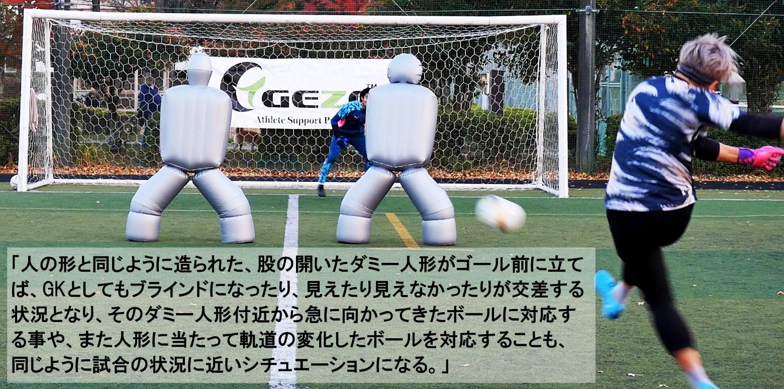 味方DFが視界を遮り、見えにくいところからシュートが放たれるといったブラインド練習や、ダミー人形に当たってボールの軌道が変わるディフレクションへの対応力を養うことで、実戦に即したトレーニングを実現します。